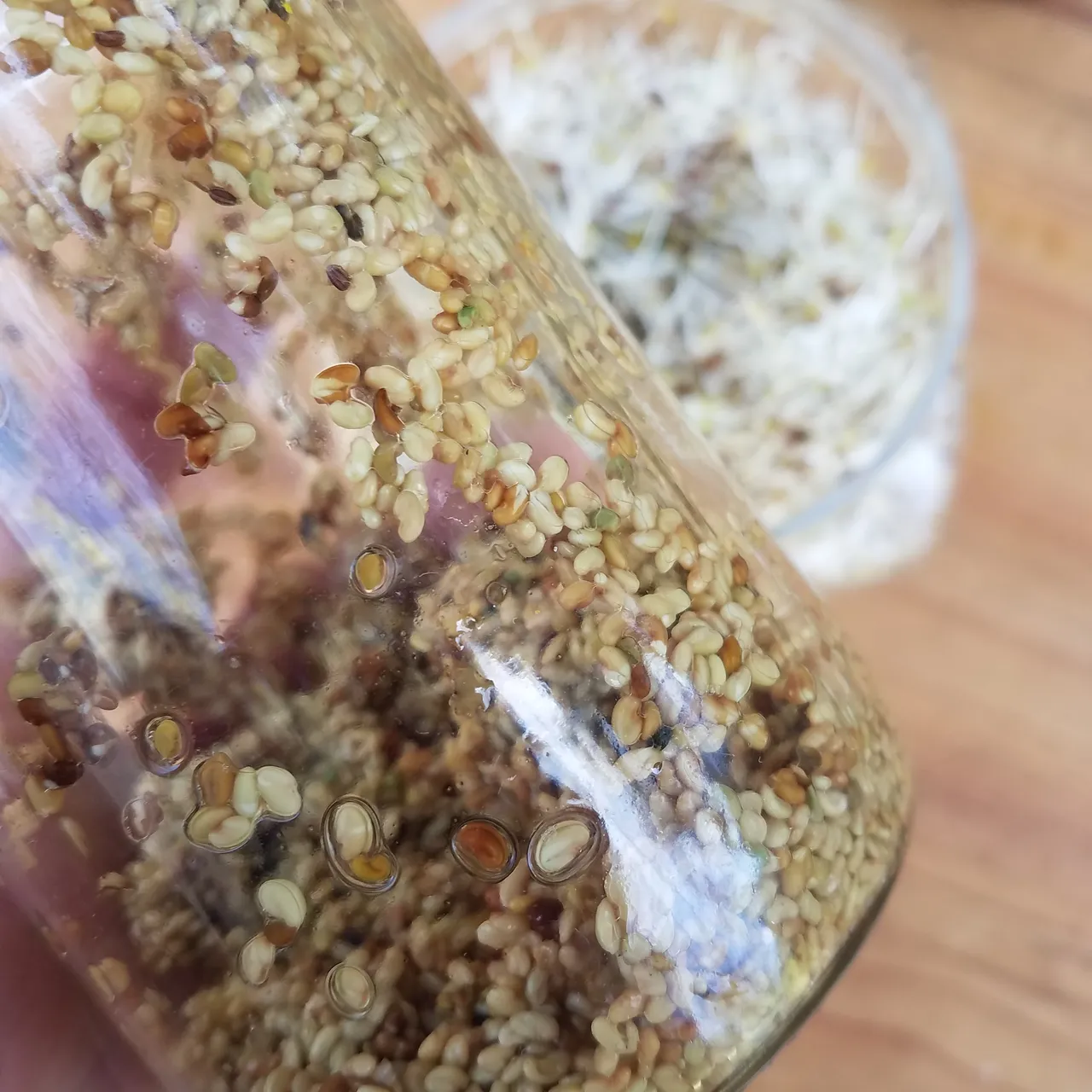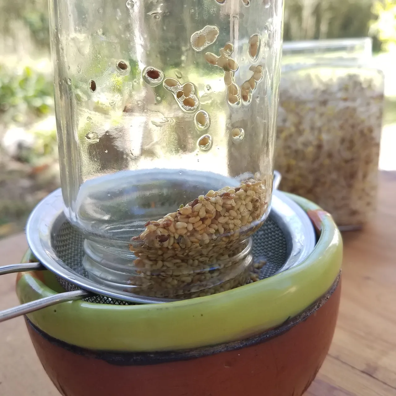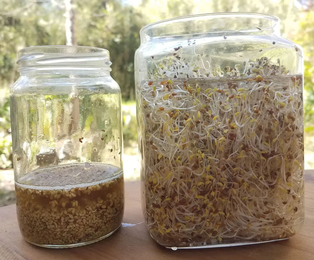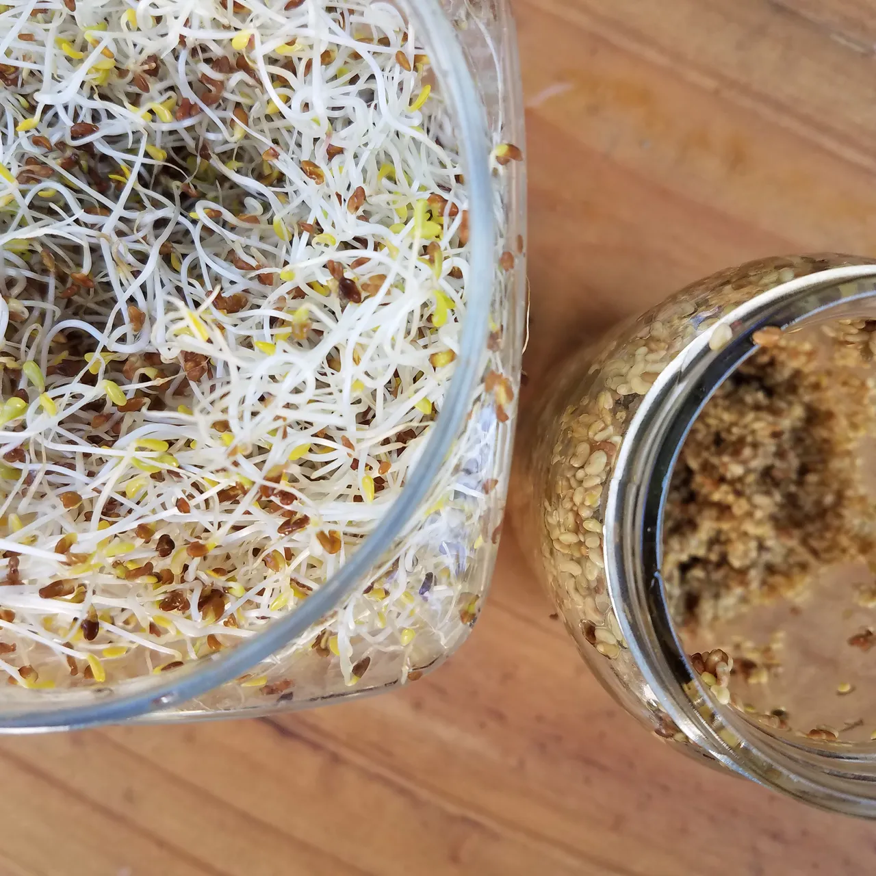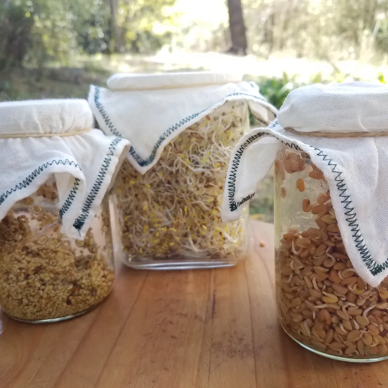 Alfalfa, fenugreek, wheat, lentils, and sesame seeds are some of the many grains or seeds that can be sprouted in this way. All you need is access to (preferably organic) seeds, a variety of sizes of jars, cloth & rubber bands, and a secure shelf in the kitchen to store the jars.