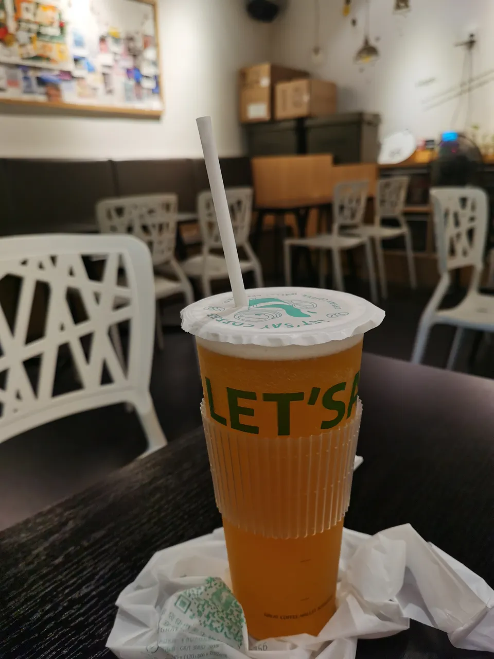 找了一家咖啡店,准备点杯咖啡,然后意识到大晚上喝咖啡会太兴奋,又琢磨了一会,店员提醒说他们店里的也有饮料蜂蜜柠檬茶,那OK啊,那就来一杯去冰的,找了一个店内人少的地方坐下,约莫10分钟左右,就制作好这一杯,看着倒是挺清爽,这我爱的橙色哈,喝起来口感还是不错的,甜度适中哈,有柠檬的清香.