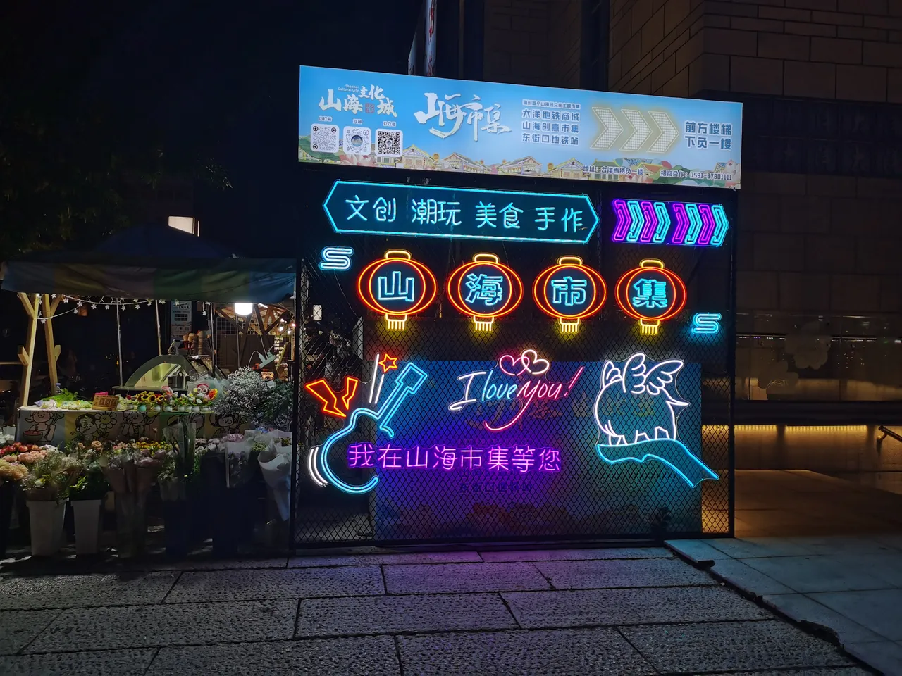 这广告牌有点意思哈,我在山海市集等你,前面还看到几个人在这里拍照打卡来着,原来是宣传大洋负一楼的文创,潮玩,美食和手作,哇,还有美食啊,OK,那我就下去转一圈,嘿嘿,主要冲着美食区去的哈.