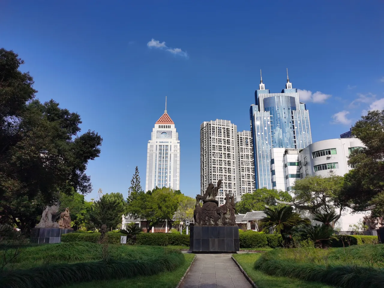 公园外高楼林立,车水马龙,公园内是绿树满园,鸟语花香,还有几座造型各异雕塑落此,属实有点羡慕住在这附近的居民们,这就是他们家的后花园呀;