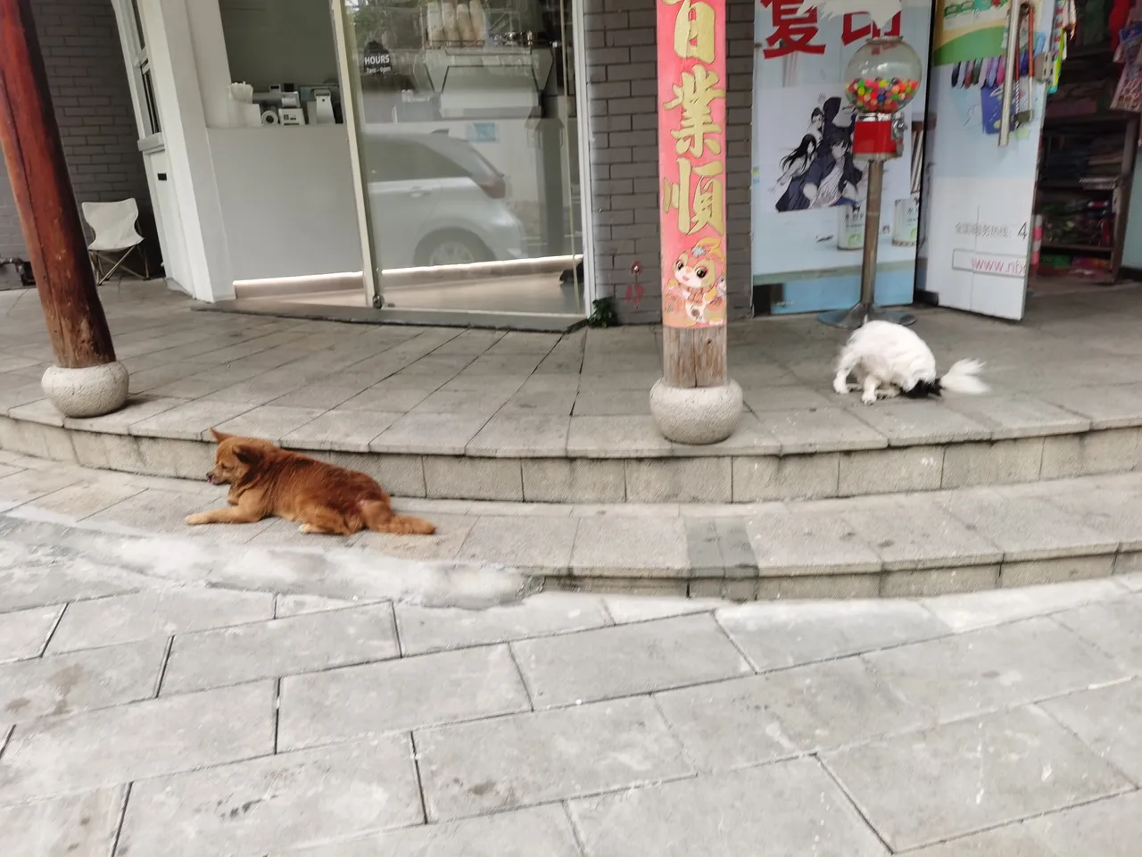 路过这家小店门口,看见两只狗狗百无聊赖的在门口,一开始看到我走过,其中一只小黄还跑过来在我的脚边闻了闻,然后开始不停地摇尾巴,另外一只小白还在原地挠着身体,我对着小黄挥了挥手,不一会就自己跑去旁边坐下了,不停地吐着舌头,看样子它有点小兴奋,虽然我已经有三年左右没有养狗了,但是每次看到狗狗们还是会有一种别样的情愫,希望这些小生命能被温柔以待,毕竟它们也是人类的好朋友.