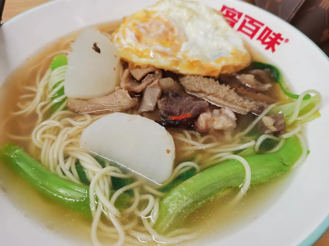 又来这家客百味关顾啦,被看一间小小的店面,生意还真不错,每次去基本上都是客满,而我选择是最靠里面的位置坐,点了一份店内的招牌牛杂面,天气冷了,尤其喜欢带汤的面食,喝了温胃更暖身,他们家的汤底是很醇厚,貌似有加上中草药,吃起来有一股清淡的草药,价格也蛮实惠,牛杂给的量也足够,额外还加了一份煎蛋,多来点营养补补,嘻嘻.