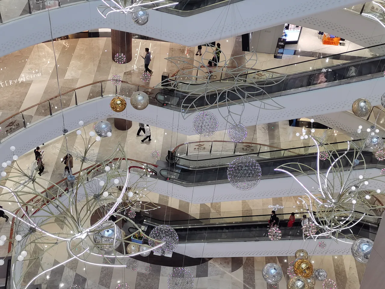 我们逛到五楼,没想到啊,工作日来这边逛街的人还真不少,从商场5楼往下看,居高临下的感觉还不错哈,朋友有点恐高症,她没敢多看两眼,说是会头晕;这个角度看下去,灯光闪耀亮眼,有点艺术殿堂的感觉.