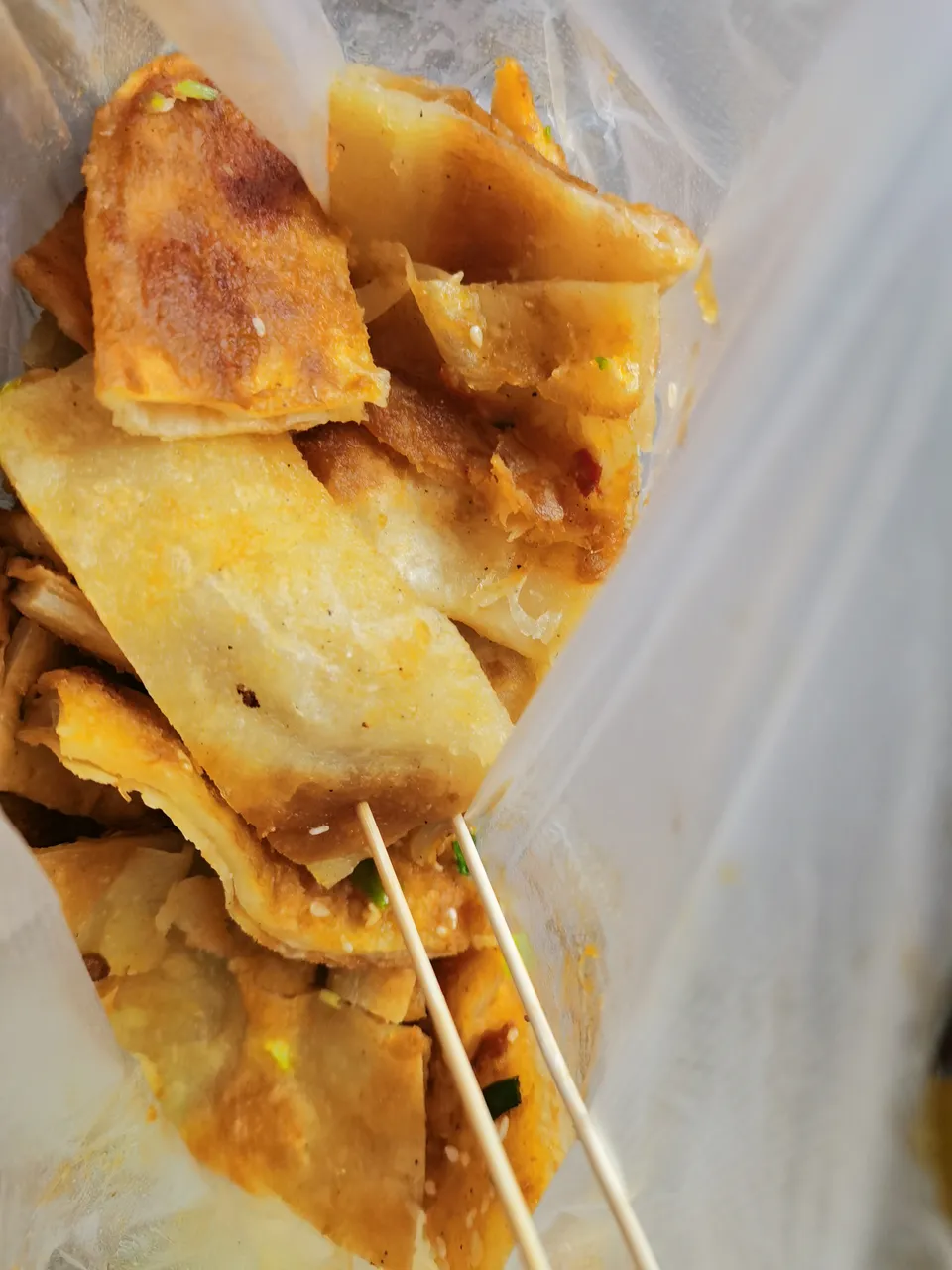 拿到切好的酱饼,我就迫不及待的先尝一小块,妈呀,好吃到炸了,饼子外皮是酥脆的,内里中间夹着肉末子,主要是他们家的酱料绝对是秘制的,那味啊,是真特么的香,唯一美中不足的地方就是不够辣,店里的小哥说我是会吃辣的,只是大部分客户吃不到太辣,所以没辣口也不敢多放,下次我再买的时候,可以提前说一下,他可以帮忙再加点辣,OK,那可真好啊.