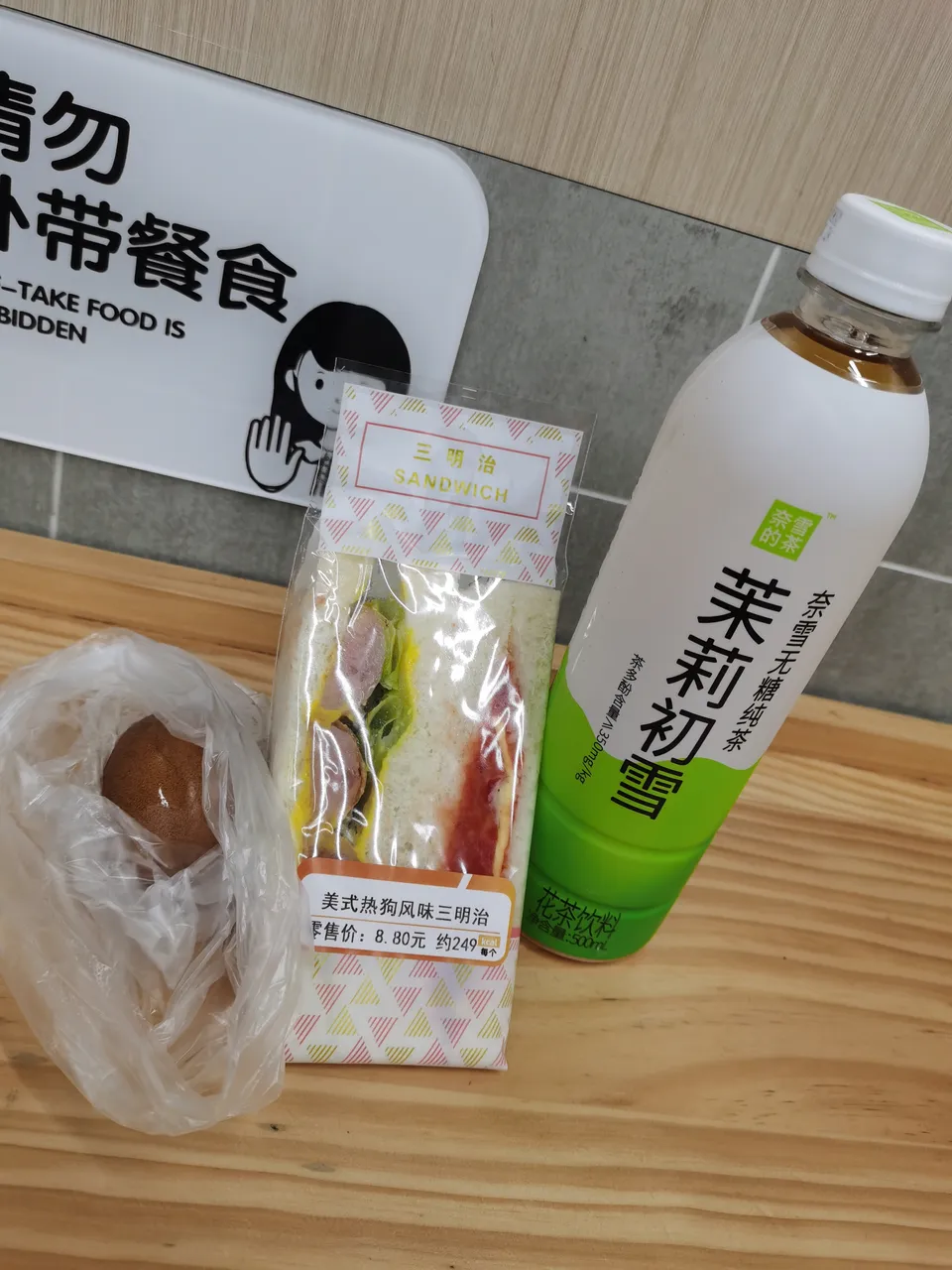 早餐三件套,今天换了一家六意超市,选了茶叶蛋,三明治,茉莉花茶,原本是有三明治套餐,饮料可以自选黑咖啡,价格也只要11元,只是这家店停水,所以就没能提供,就连肉包和玉米包之类的也都没有,而且店里的收银机子还坏了一台,我看那个收银的小阿姨也是挺尴尬的,又是向来店内的顾客解释着,一个人忙里忙外的,这里是地铁的出口人流量比别家来得大,她似乎有点自顾不暇的,我问她店内这么忙,怎么只有一人?她说平时高峰期是两个人,另外一个同事还没来店里.