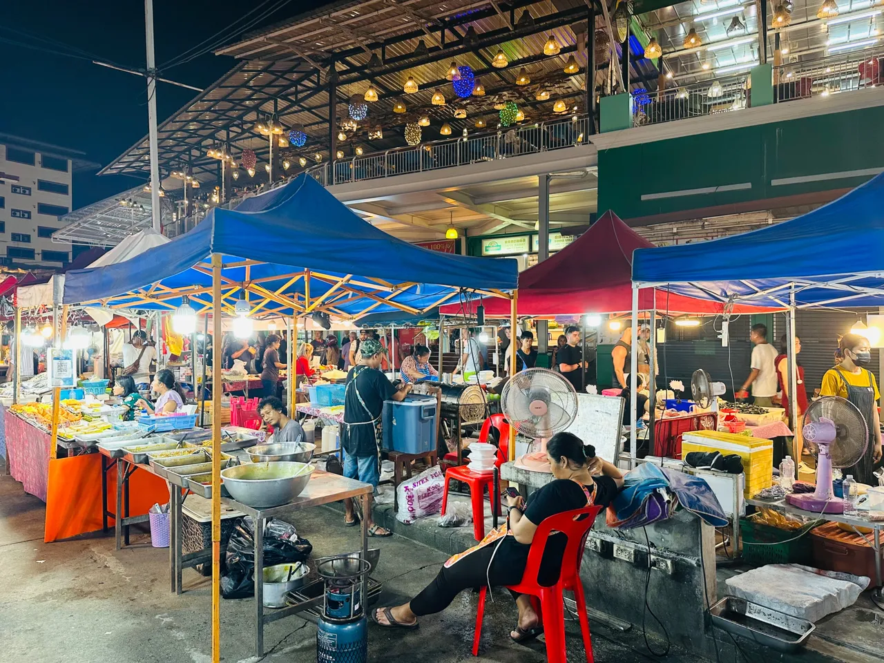 班赞海鲜市场前门是海鲜美食区,那里也是清真区,没有猪肉可吃,可是那个市场旁边有个夜市却是另一个美食区,是有卖猪肉吃的夜市。