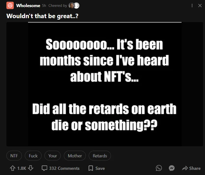 Take a look at these memes that went viral on 9Gag / Reddit recently. This is the public opinion: NFTs are worthless; people who bought NFTs were stupid; and people who still defend NFTs are even stupider (or a smartass trying to earn some money).
