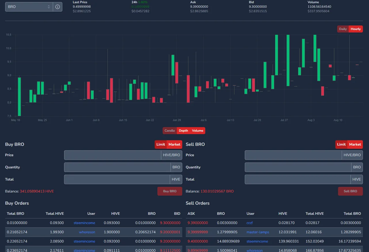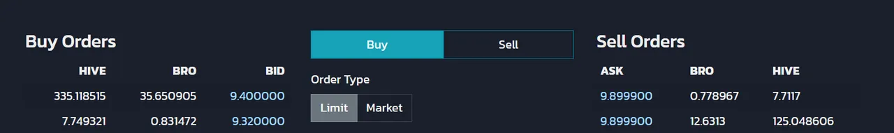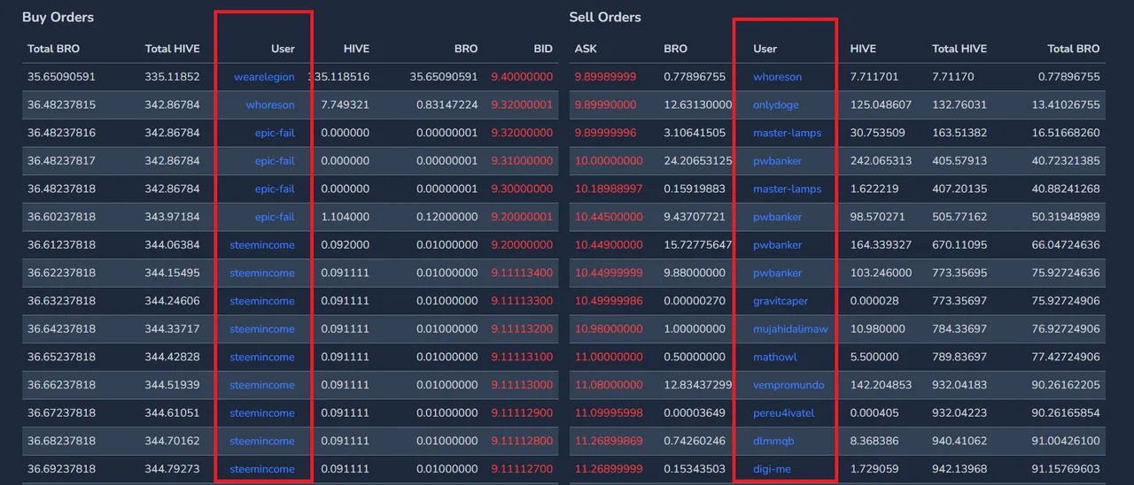 Nas visões comuns que usamos para acessar o mercado da Hive-Engine, como a Tribaldex ou a Leodex, nós temos acesso ao "book de ofertas" de forma anônima. Por exemplo: na imagem abaixo, vemos que tem alguém comprando 35.65 tokens BRO à 9.4 Hive cada, e que tem alguém vendendo 12.63 BRO à 9.89 Hive cada. Porém, não sabemos QUEM são essas pessoas: quem está vendendo? Quem está comprando?
