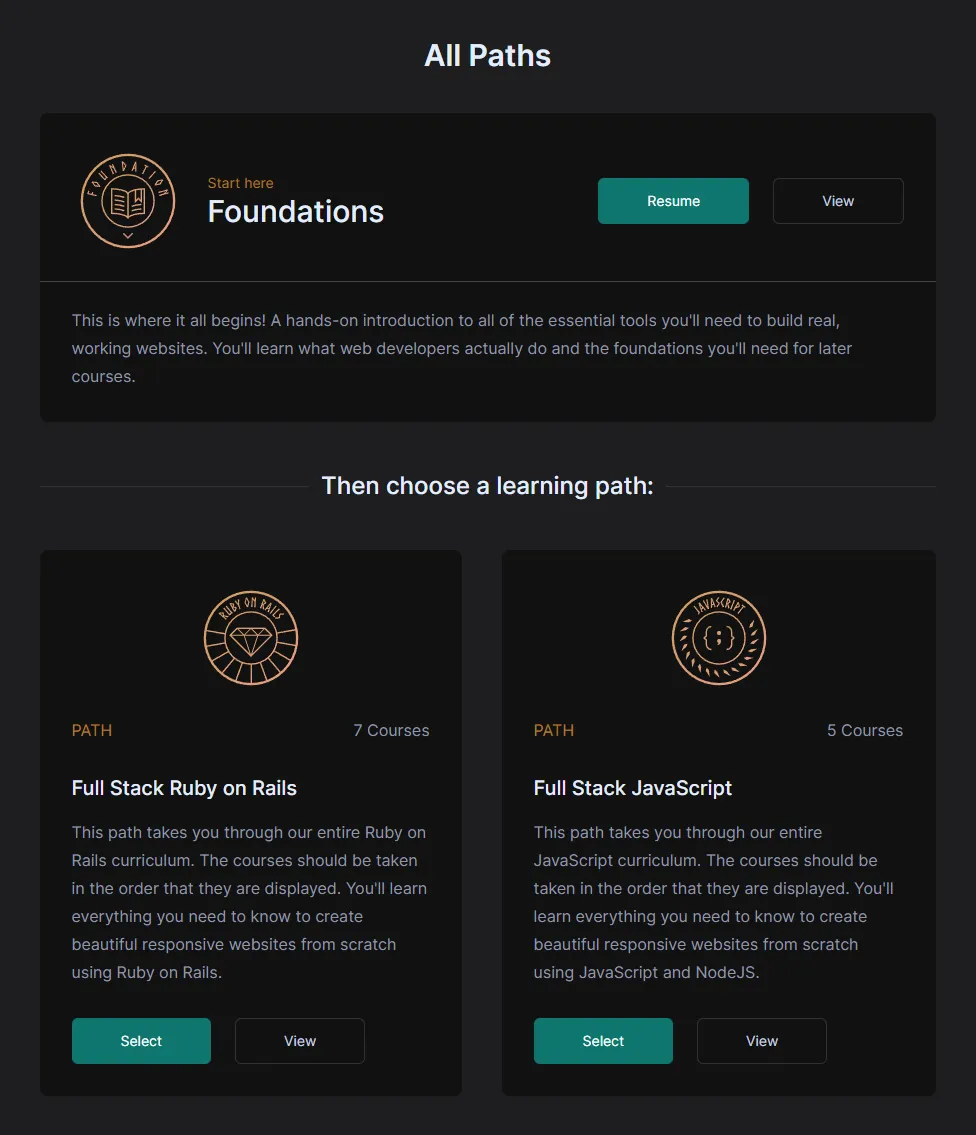 Depois, eles oferecem dois "Caminhos": JavaScript, e Ruby on Rails. Esses cursos são, de fato, bem mais complexos e profundos, com a ideia de formar programadores profissionais de verdade. Eu, até o momento, estou mais propenso a seguir o caminho de JavaScript pois, conforme várias fontes como essa aqui, é a linguagem de programação mais demandada atualmente, enquanto a RoR já é mais "das antigas". Prefiro focar no mais popular, rs.