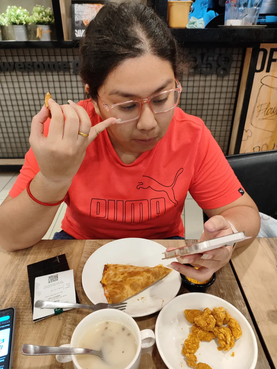 This is a good bowl of mushroom soup. I love the thickness of the mushroom soup. A hot bowl of soup with pizza. Yummy.