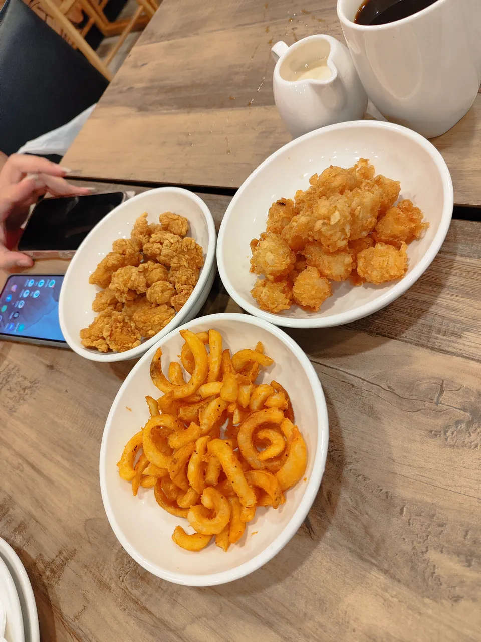 Some curly fries. Some popcorn chicken.