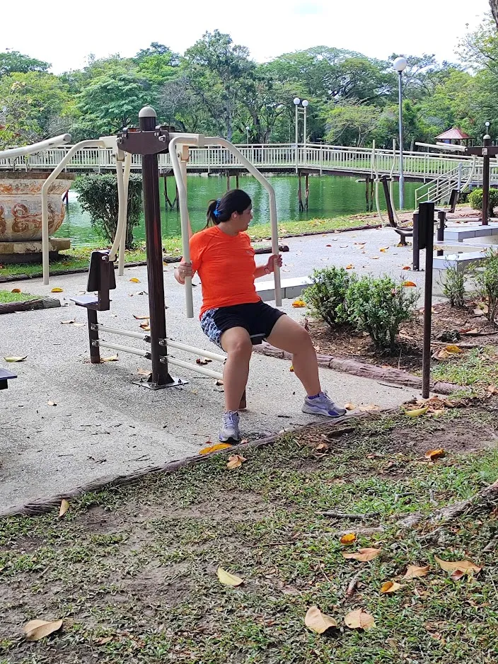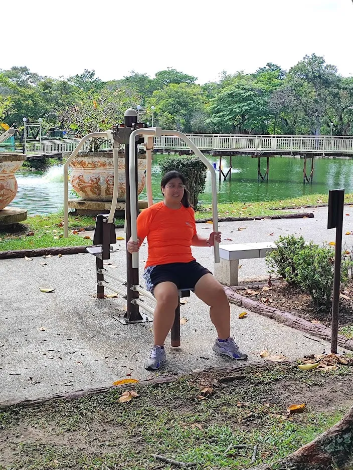 This is one of my favorite chest workout machines out here. It uses my own body weight to push me upwards. The free gym is outside in the air.