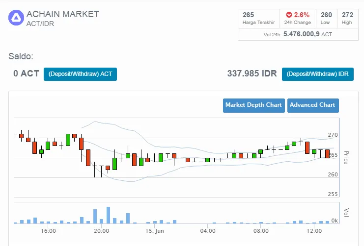 Achain kini sudah listing di Indodax. Per koin Achain kini senilai dengan Rp 265,-. Harga itu akan berfluktuasi, naik turun senuai dengan kondisi pasar.