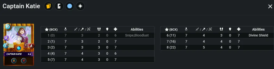 Captain Katie is a force to be wreck-en with as her stats are some of the best for a magic card. At base level she already has snipe and blood lust abilities. Add on top of all that a magic attack of three and a speed of three with a health of six this card can be a perfect middle to rare of the formation. I like to put her near the rear of formations just to keep her alive as long as possible. The snipe ability truly comes in handy.