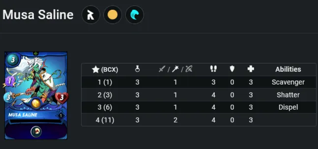 The card in focus is Musa Saline. One of the newest rewards cards in the game as its a Soul Bound card it can not currently be bought or traded. I only have a level one of such a card but it has been quite useful even at base level.