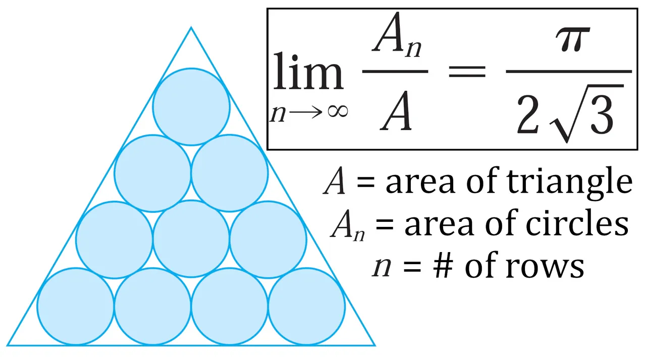 In this video I determine the limit that the area of an infinite number of circles that can be packed inside an equilateral triangle. I represent this area as a ratio of the area of the circles divided by the area of the triangle. To solve this problem, I first determine an expression for the radius of the circles in terms of the length of the triangle. I then count up the number of circles, and determine the equation of the area of n circles. Then, I plug in the length of the triangle as a function of the triangle's area. This then obtains a division of the area of the circles divided by the area of the triangles. Taking the limit as n, the number of rows of circles, approaches infinity, we then obtain the limit we were asked to find. Truly amazing stuff!