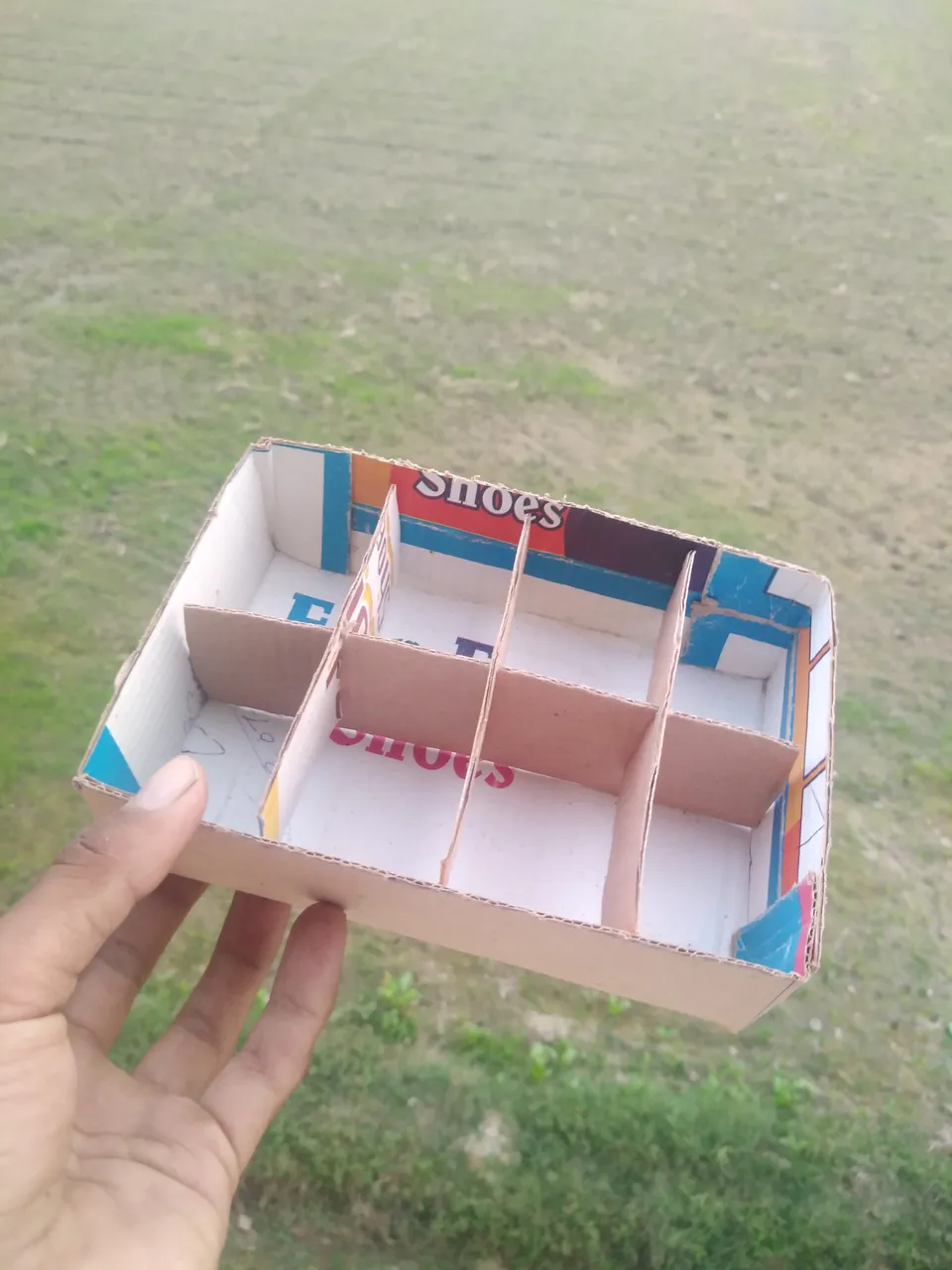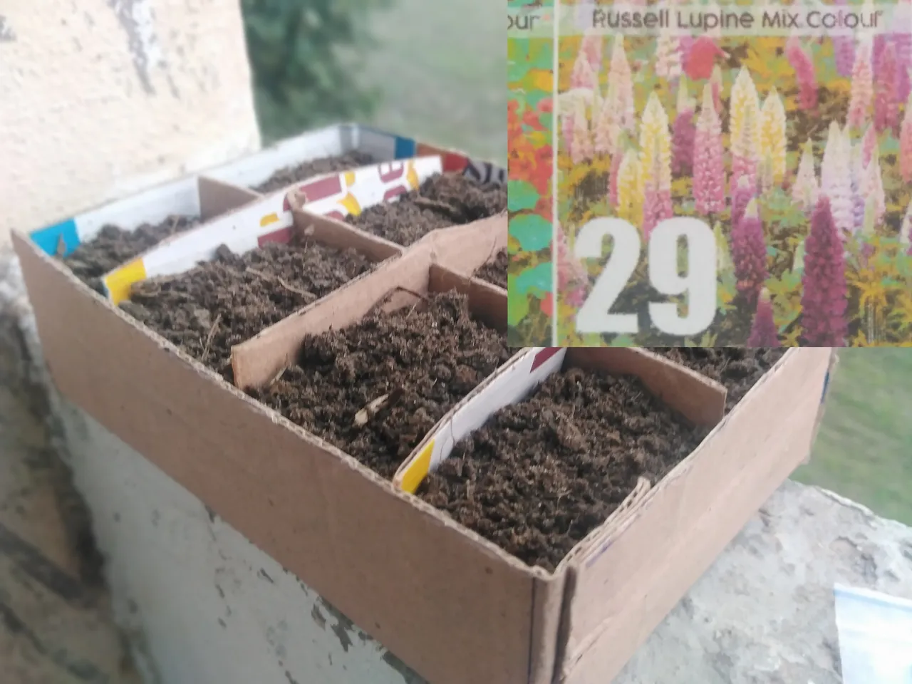 The next thing was to plant these seeds as I have no space in my beds to raise them there so I must have to plant them in a pot so have made this box out of cardboard or a shoebox 😁 and add some compost and normal garden soil Ive planted 1-2 seeds per each square and watered them I hope they will soon turn into nice seedlings and later I will a a blooming lupin corner in my balcony.