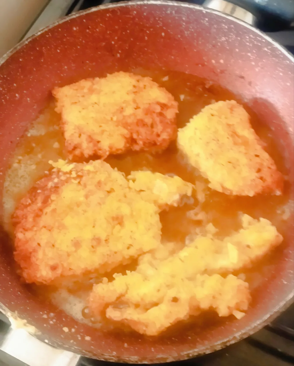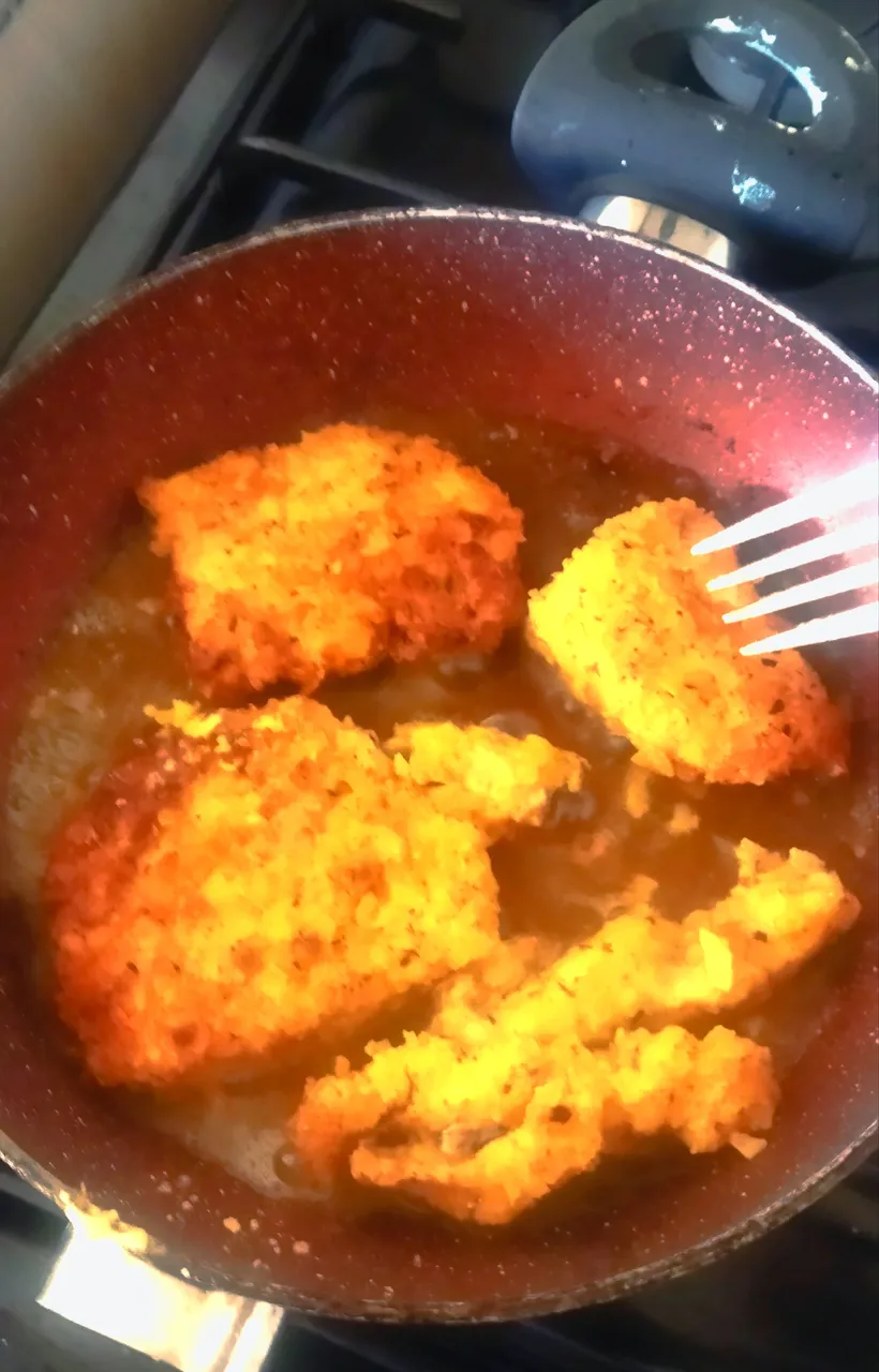 Öncelikle tavukları yumurtaya buluyoruz ve cipsi karışımla kapliyoruz. Bütün tavuklara bu işlemi tekrarlıyoruz. Daha sonra yuksek ısıda yağda iki taraflı kızartıyoruz.
