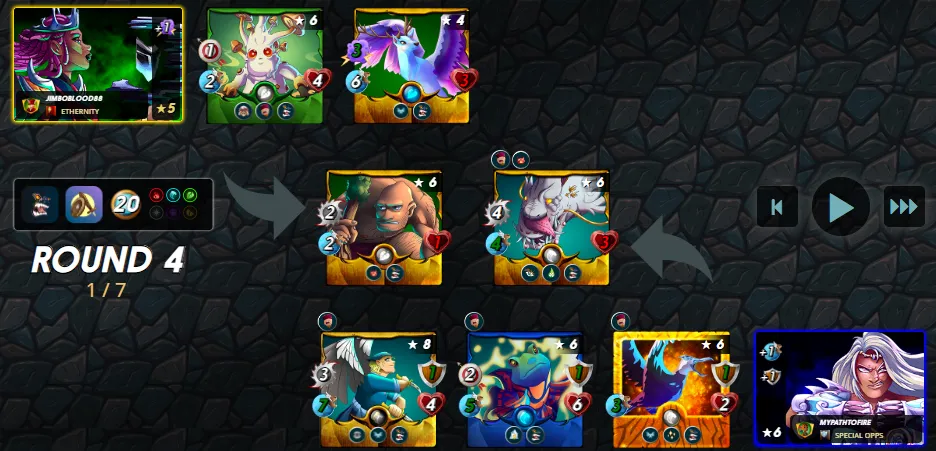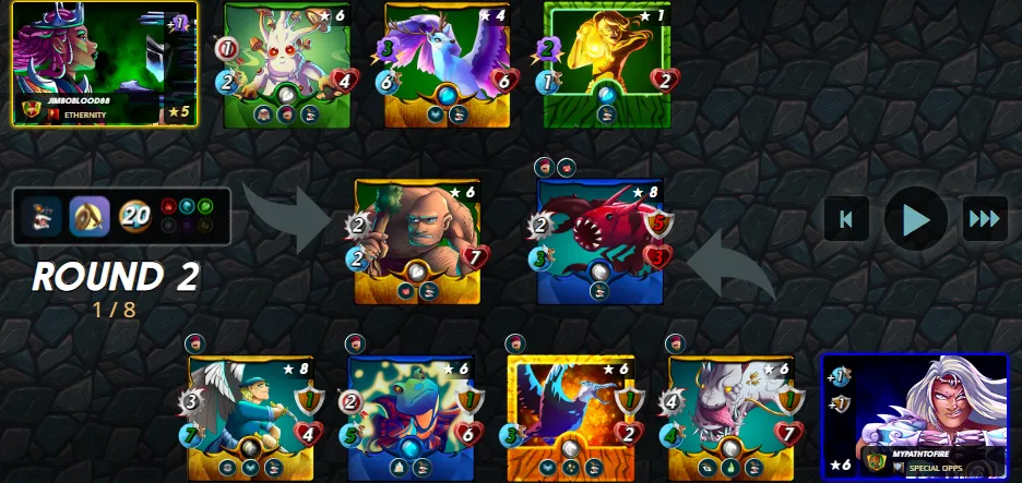 Round 2 starts well with Pelacor Bandit taking out Khmer Princess. Now it is Regel Peryton's turn as he takes out Cruel Sethropod with his 3 magic attack. It is a devastating blow as he still has 5 shield too! A better choice to use here could have been Xenith Monk with his heal and void abilities. Good to consider for next time, he is also a rare monster which is ok to use.