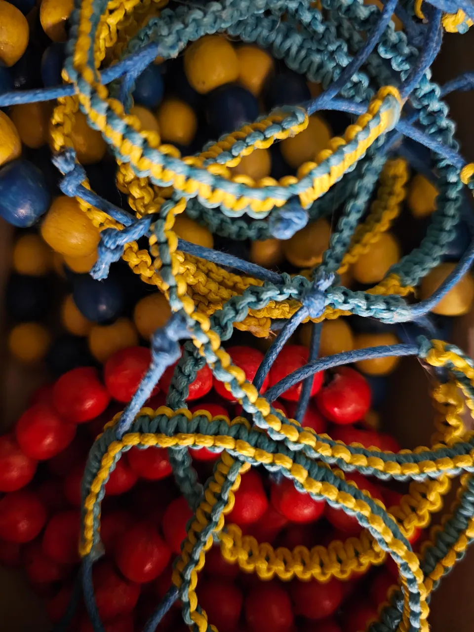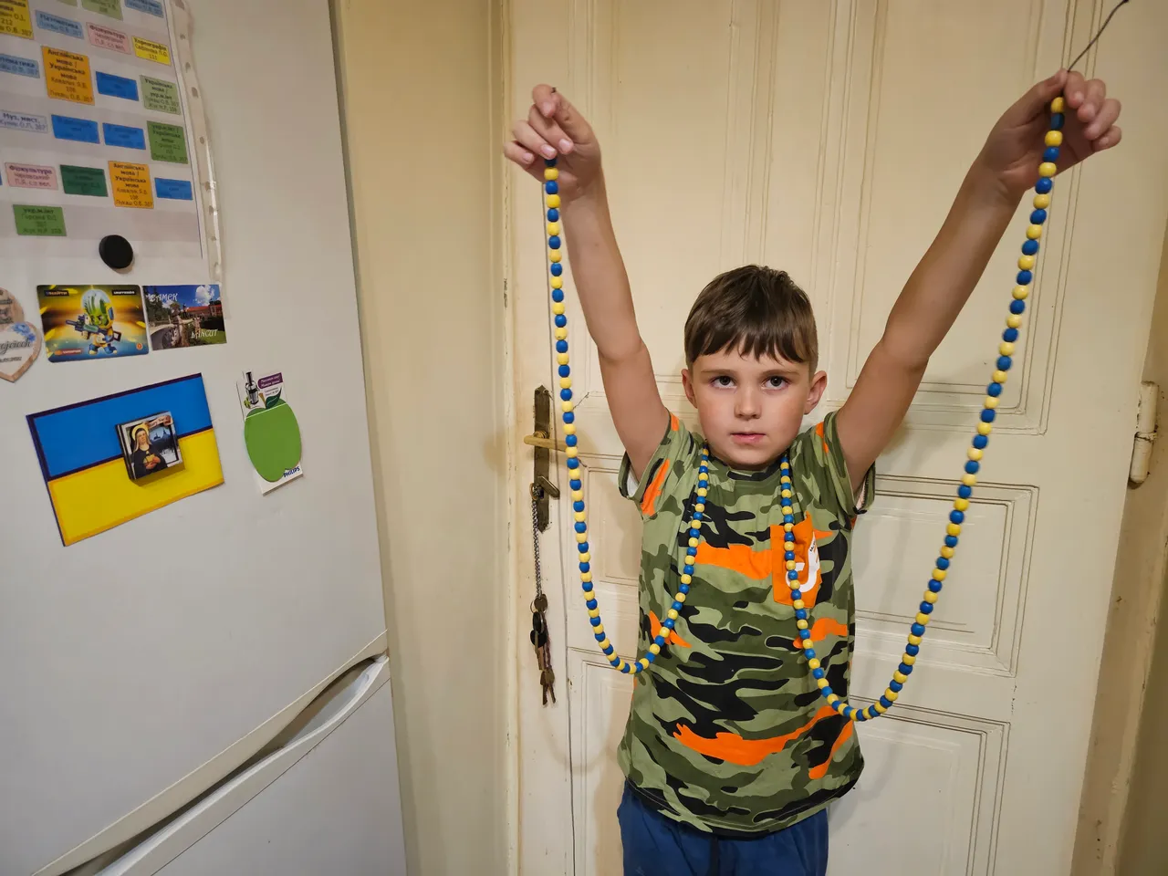 Maxim helps me, he places wooden balls on a black rubber band. I painted the balls in blue and yellow, and I make bracelets from them.