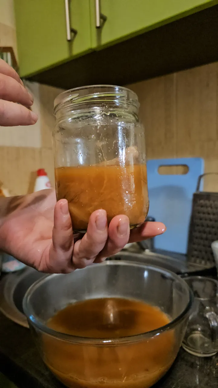 He told him in detail why he needed more than 20 liters of apple cider vinegar, and also asked to give him a vinegar mushroom to eat. If you don't know, vinegar fungus grows on the surface of apple cider vinegar under favorable conditions, and it even lives on the vinegar. This is a gelatinous substance, similar to slime or jellyfish. I put all the vinegar mushrooms in a jar for Mr. Ivan. It's hard for me to tell if it was an easy sell or a hard sell. But having a good amount in my pocket, I decided that I was very lucky to make such a deal and now I have to look for apples to make more apple cider vinegar, because my orchards are almost empty.