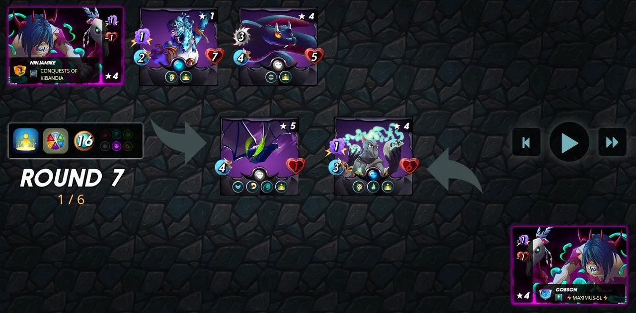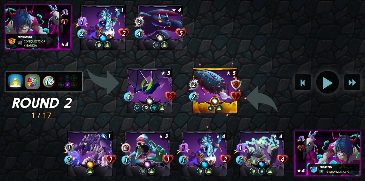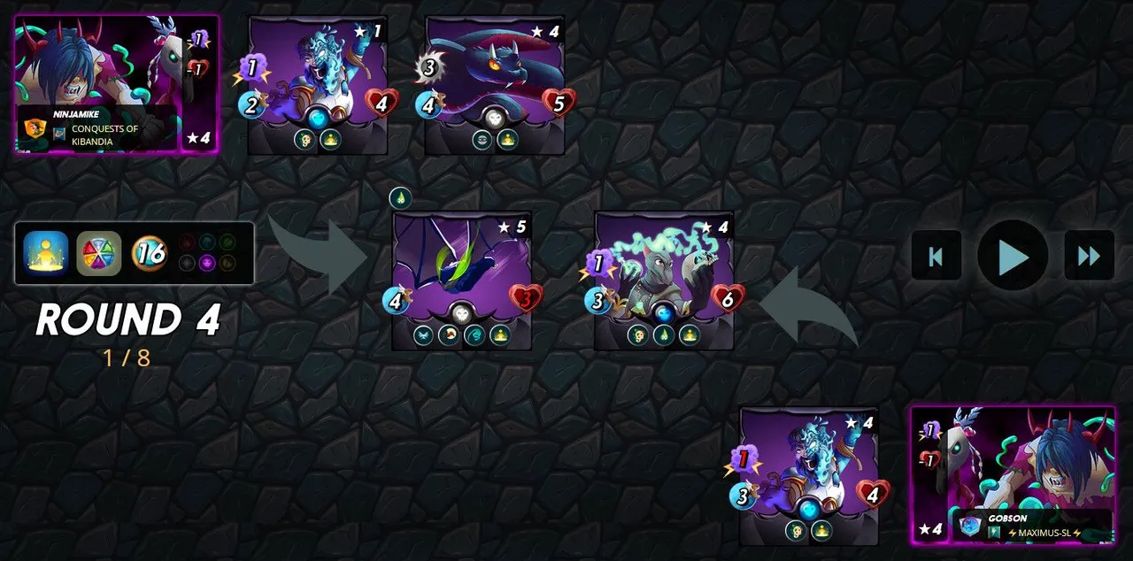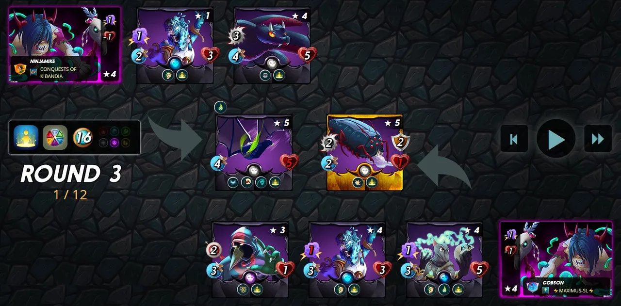 During the third round, I defeated my opponents’ monsters in first and last position. My scavenge monster in first position is holding on at three health. It is running out of monsters to scavenge from and is still dealing with the poison.