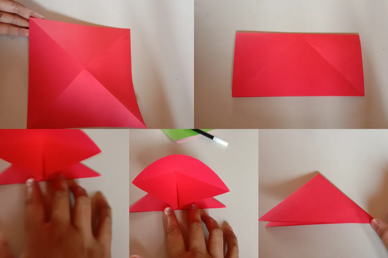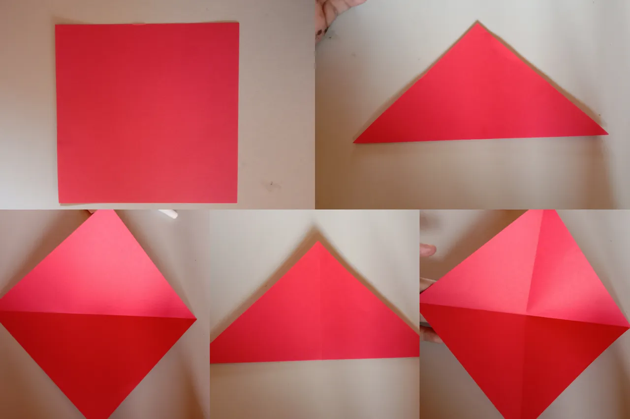 ✔️ Take paper measuring 15x15cm, then fold it in half in a triangular shape, then open it again and fold it again from the other side in a triangular shape, after it is all folded there will be visible folds.
