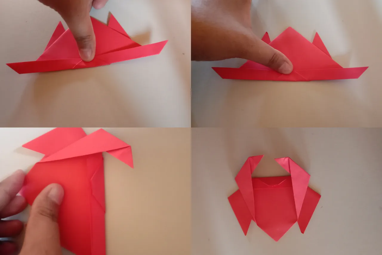 ✔️ Then we fold the top part to make the head a little, then turn the paper over, and take the right and left sides, fold it inward according to the picture below, then it becomes a crab.