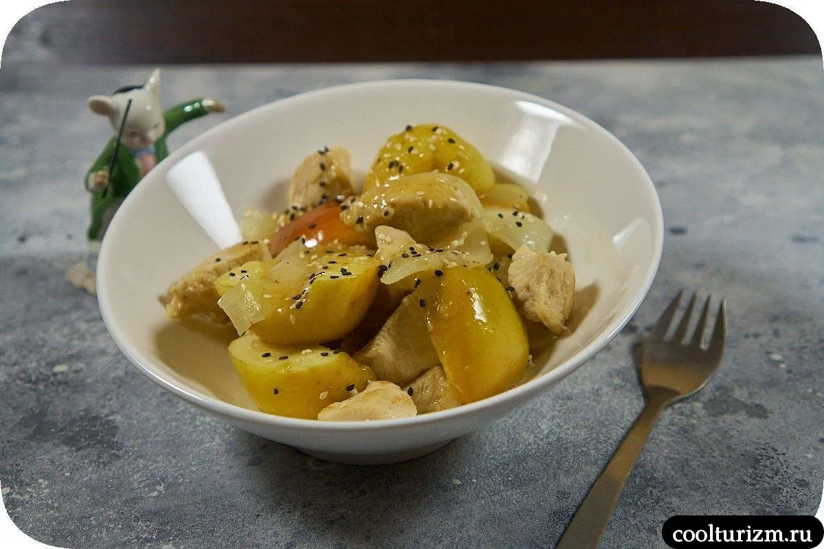 Today we will cook chicken breast with apples and onions in sweet caramel sauce. The dish will be cooked in a wok. A very interesting combination. Apples will serve as a light side dish for chicken, so no additional side dish is needed here. Let's go, it will be very sweet!
