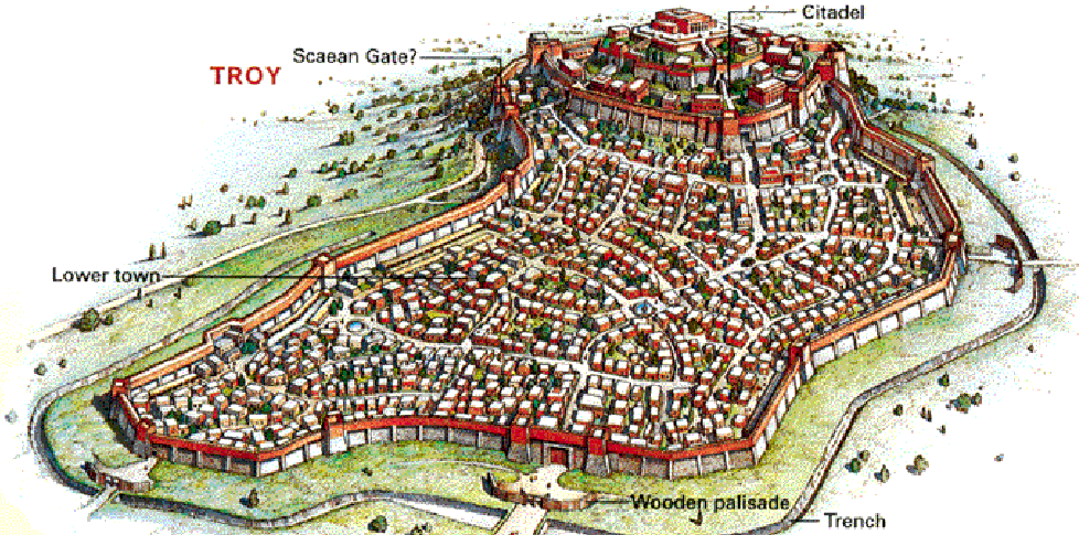 Troy was built around 3000 before Christ on the hill of Hisarlik. At that time a small settlement was built, its city wall was made of unhewn natural stone. Inside the fortification there are long houses, most of which consist of only one room and were built of clay and wood plaits.