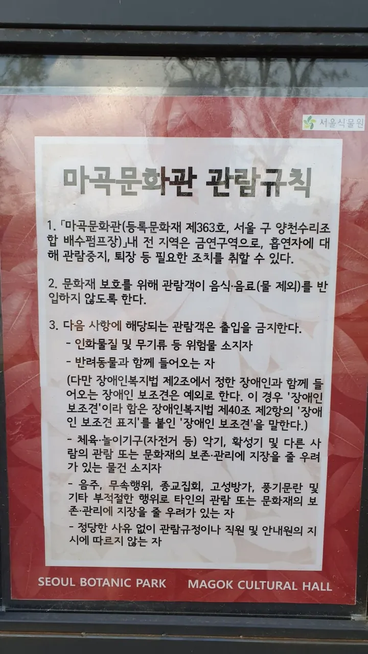 - 「마곡문화관(등록문화재 제363호, 서울 구 양천수리조합 배수펌프장)」내 전 지역은 금연구역으로, 흡연자에 대해 관람중지, 퇴장 등 필요한 조치를 취할 수 있다.