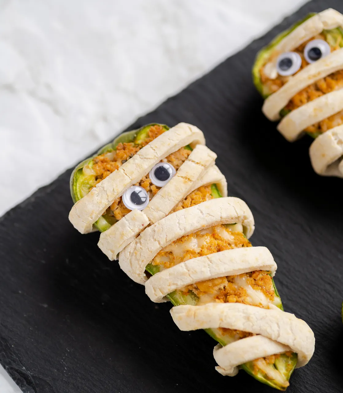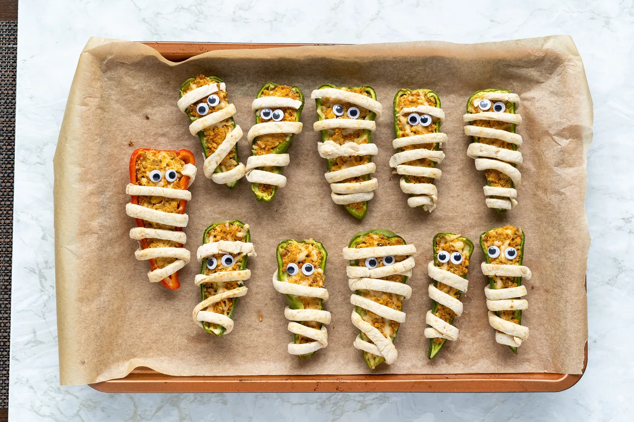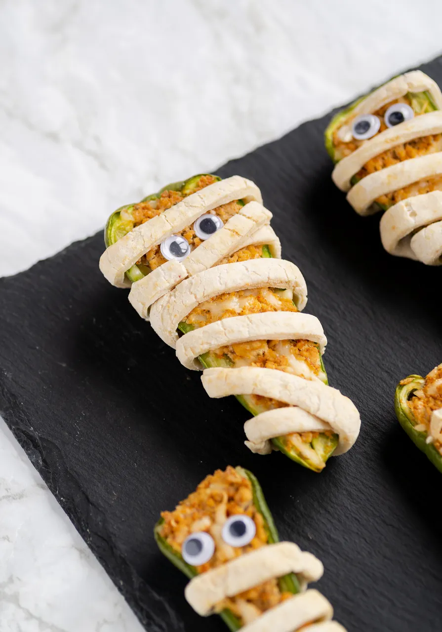 For that extra touch of authenticity, add edible eyes to these mummy peppers. You can use a variety of ingredients like peas, beans, olives, or even small bits of vegan cheese to craft their mesmerizing gazes. The eyes not only make them look cute but also add a pop of flavor and texture to the dish. Your guests will love the whimsical aspect of these mummies, making them a perfect conversation starter at your Halloween bash.