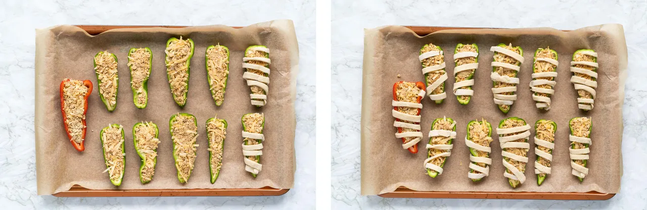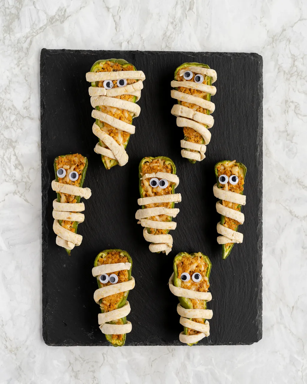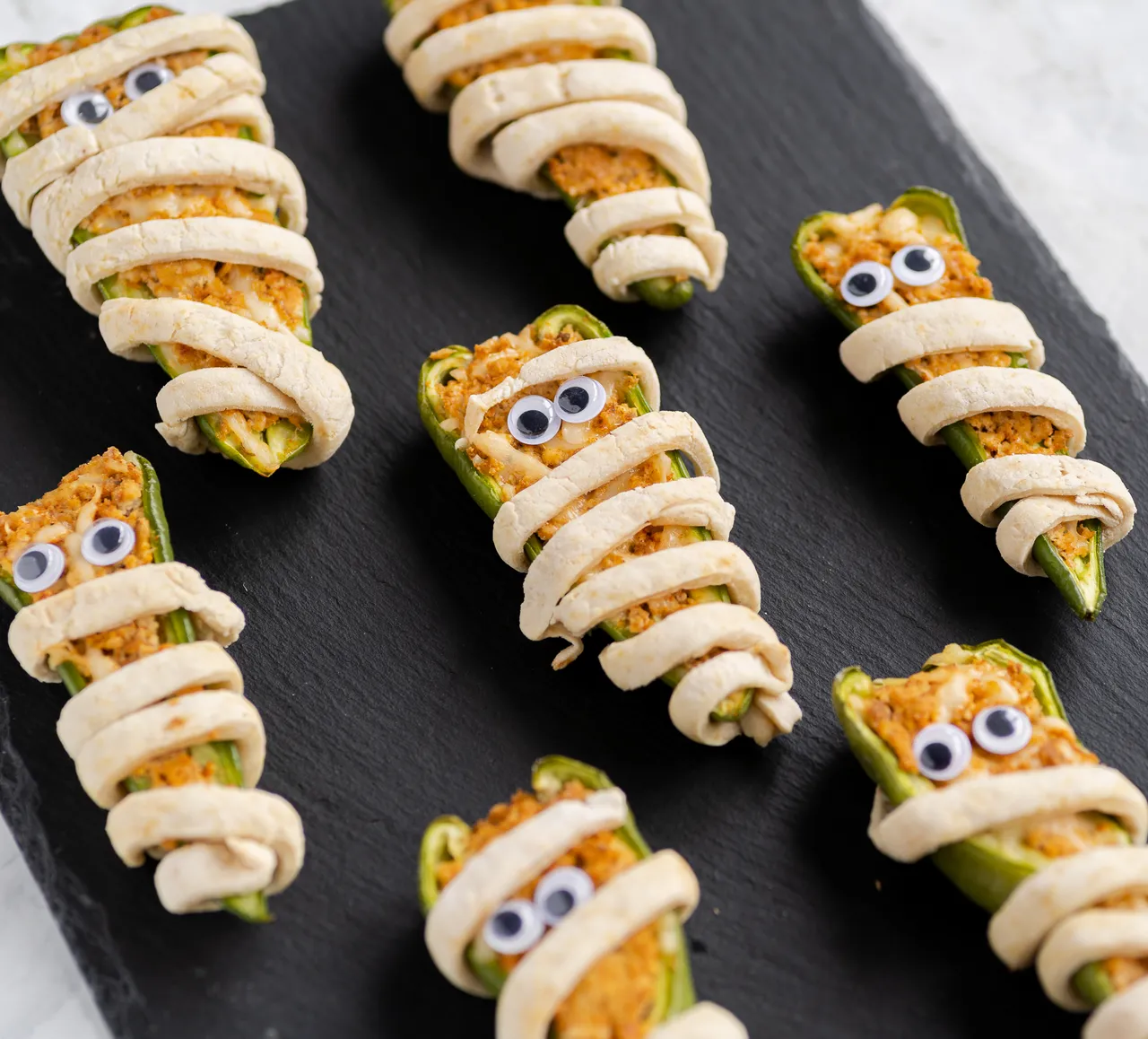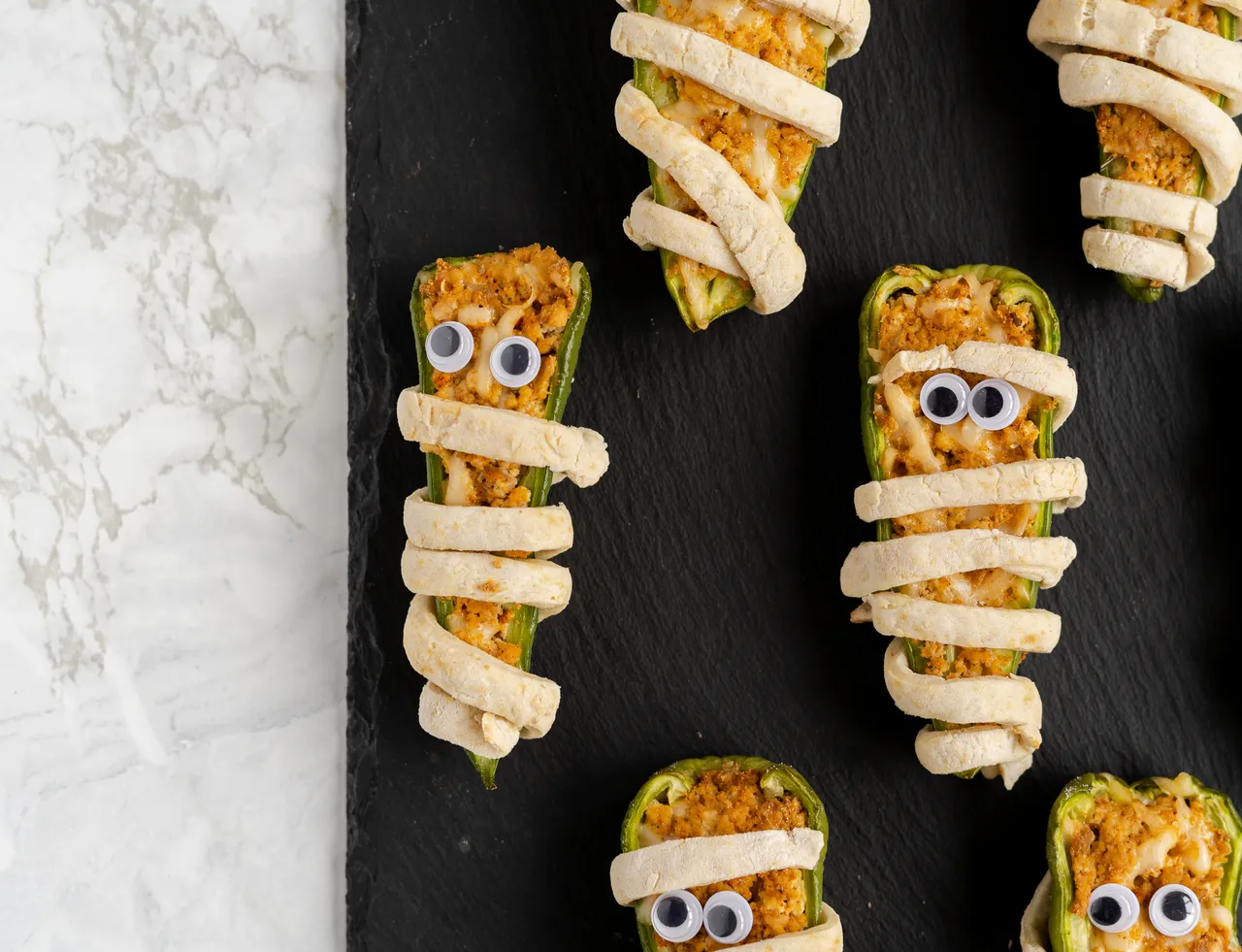 For that extra touch of authenticity, add edible eyes to these mummy peppers. You can use a variety of ingredients like peas, beans, olives, or even small bits of vegan cheese to craft their mesmerizing gazes. The eyes not only make them look cute but also add a pop of flavor and texture to the dish. Your guests will love the whimsical aspect of these mummies, making them a perfect conversation starter at your Halloween bash.