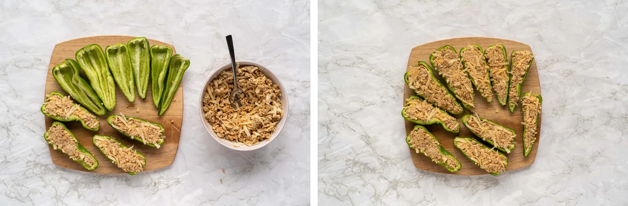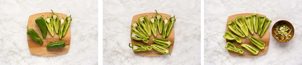 - Cut the peppers in half lengthwise and remove the seeds.