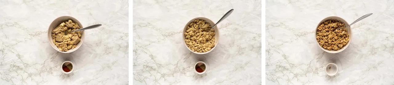 - Crumble the tofu with a fork or with your hands and mix it with salt, pepper, oregano and sweet paprika.