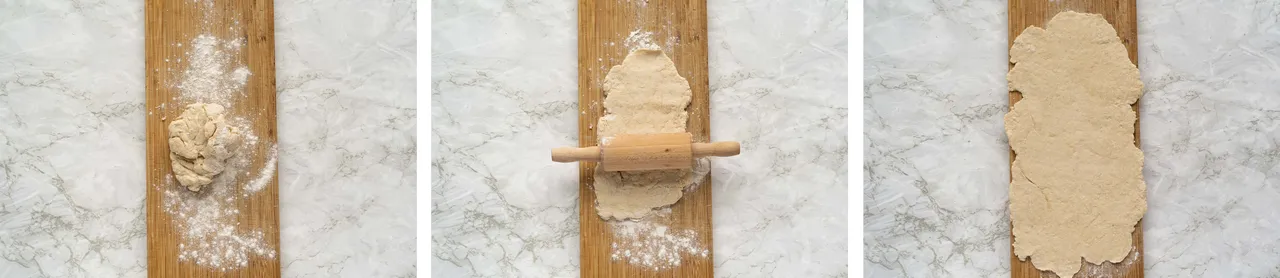 Form into a ball, roll it out to be about 0.3 cm. thick.