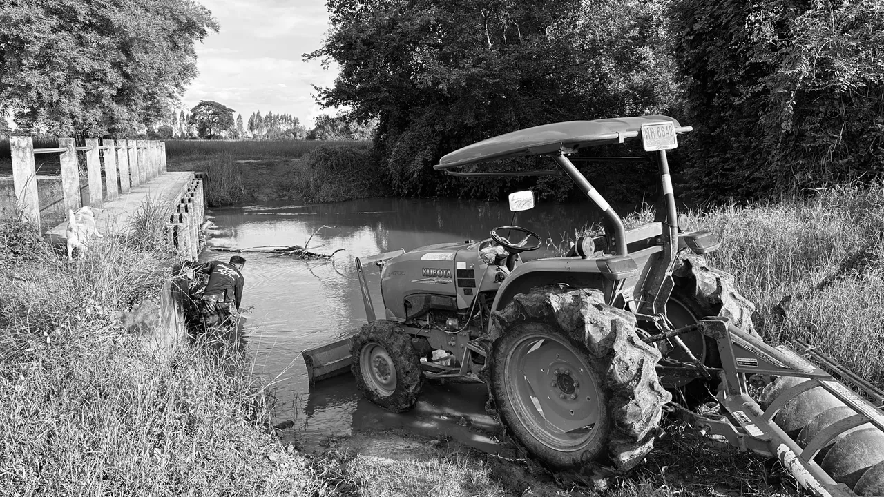 A farmer cleaning up the stuck grass and wood etc at the river with its tractor. As river will flows more faster and smoothly to prevent cloak and water rising since is now raining seasons again here. And safety for the children as well.