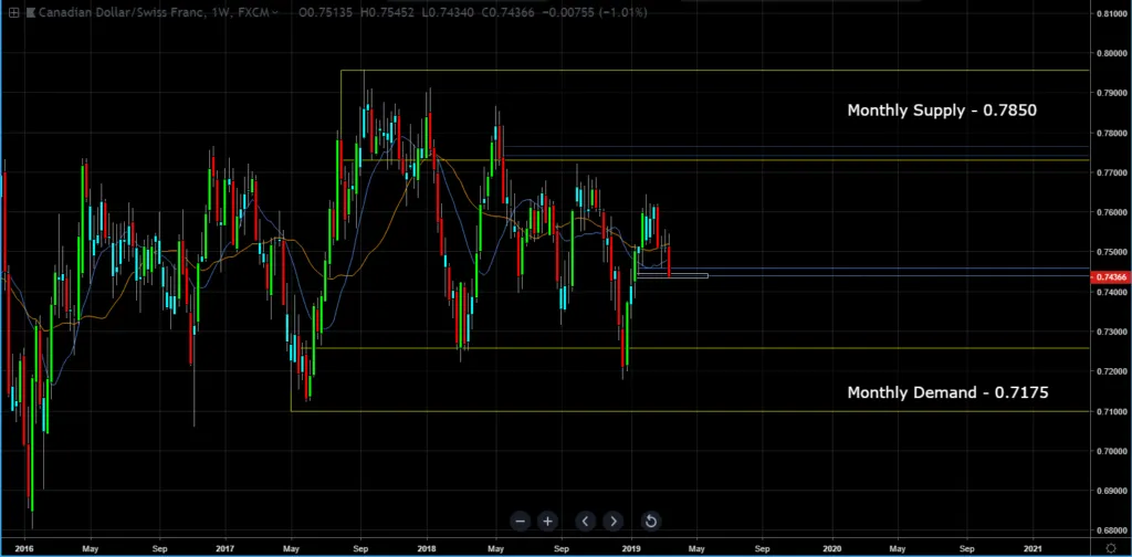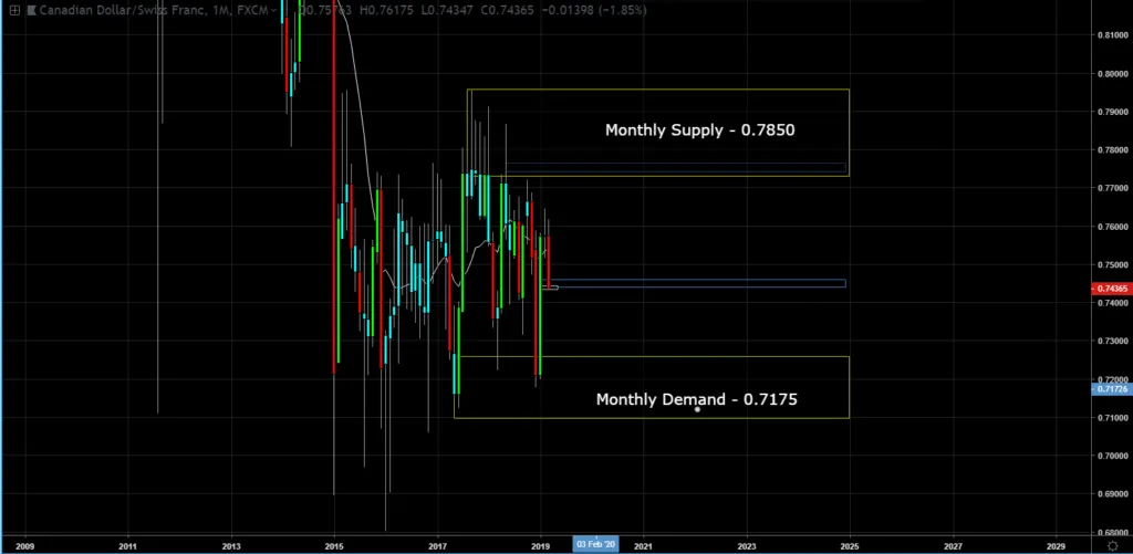 Monthly Chart (curve/range time frame) - monthly demand is 0.7175 and monthly supply is 0.7850.