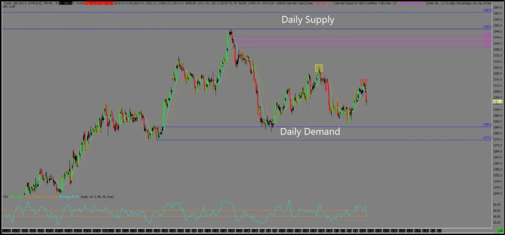 Gold futures breaking down...because the recent pivot high (red) didn't take out the previous pivot high (yellow), going long before price gets back to the daily demand would be a low probability trade.