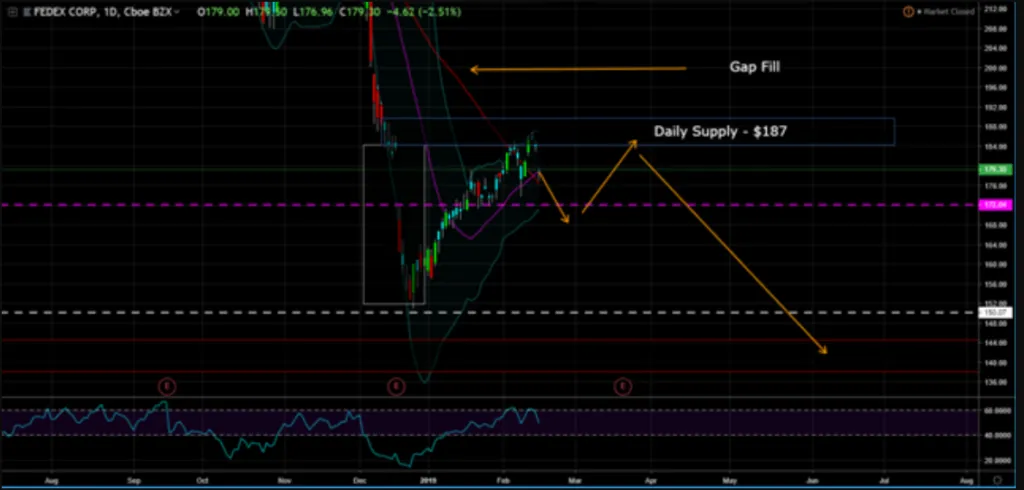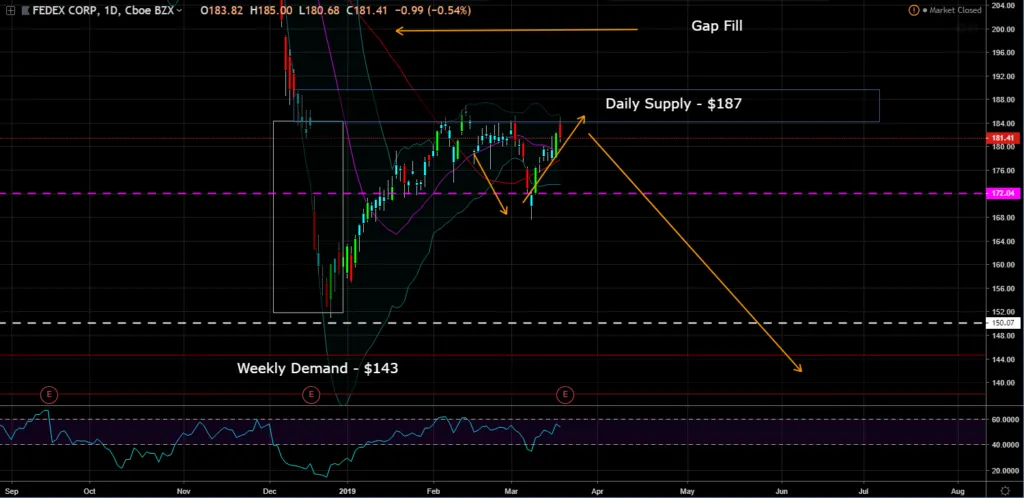 FedEx price did pull back into a daily demand zone, so one possible scenario is a break of $172, a pull back, than a drop to the weekly demand zone at $143.