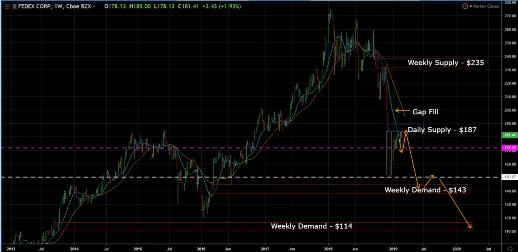 So are the equity markets next to start breaking down…I don’t know. But what I feel confident about is a further break down in the FedEx price. Since we couldn’t even breach the daily supply at $187 and close the gap, the chart suggests the weekly demand that held up in December will be breached as price makes its next leg down, with a next target at the weekly demand at $114.
