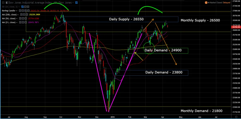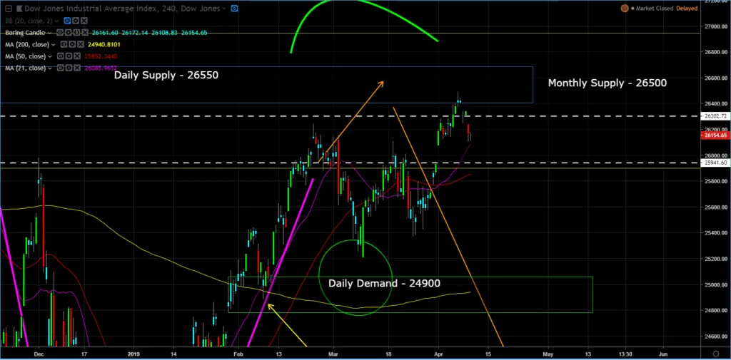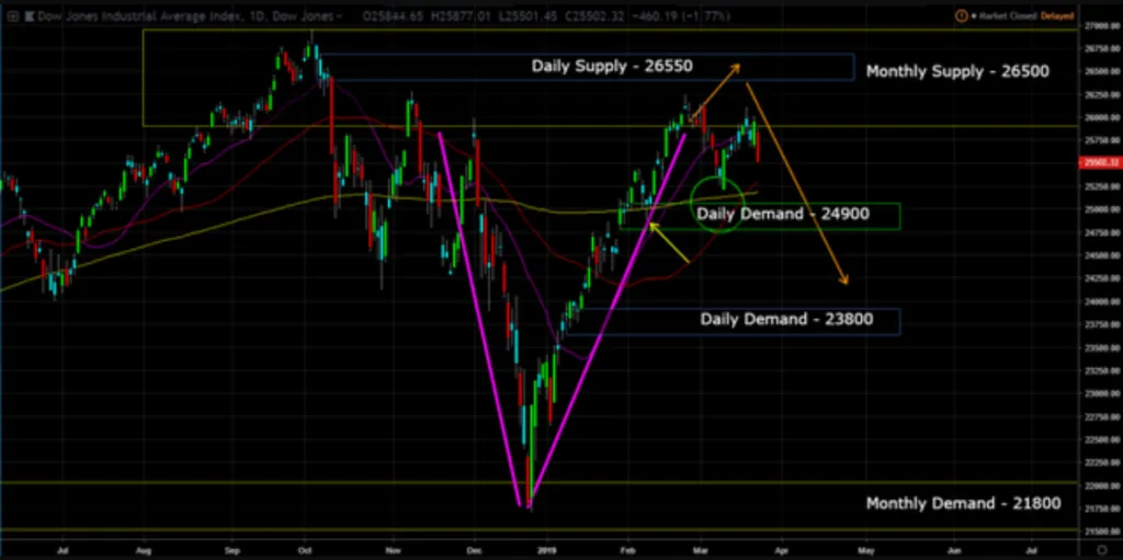 I talked about the Fed Powell leaving interest rates unchanged and for the first time since 2007, the three month bill vs. the 10 year note inverted. I talked about the thought of the fundamentals finally catching up with the technicals and how the daily demand at 24900 was still in play, despite the potential triple top. In this case, the triple top was being supported by the daily supply at 26550 which was within a monthly supply, so the chart suggested price reversing at that level as indicated by the orange arrows.
