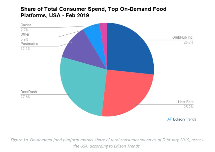 DoorDash has come up the rear and doubled its market share over last year to 28% through February, while Grubhub suffered an 11% loss in market share and in the process gave up its #1 market share spot to DoorDash.