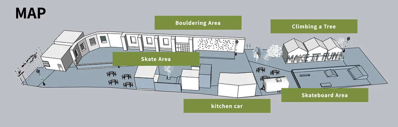 Looking into this space, it is a park with various outdoor activities like an ice skating rink on the left, a climbing wall and a small skate park at the back.