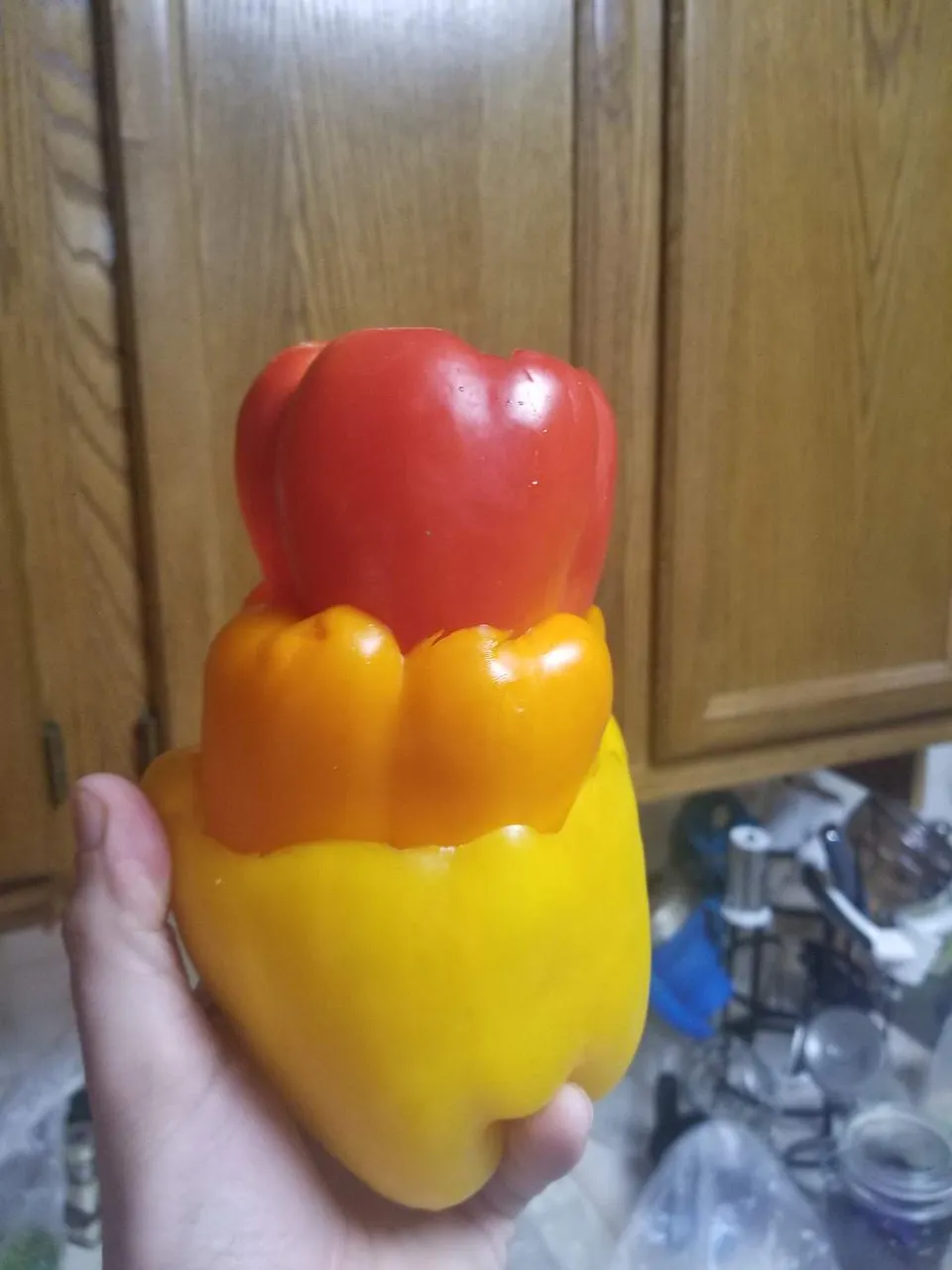 I saw these peppers growing on a plant and they look out of place. I'm used to growing little thai peppers and serrano peppers so seeing jumbo peppers growing on a plant look funny to me.