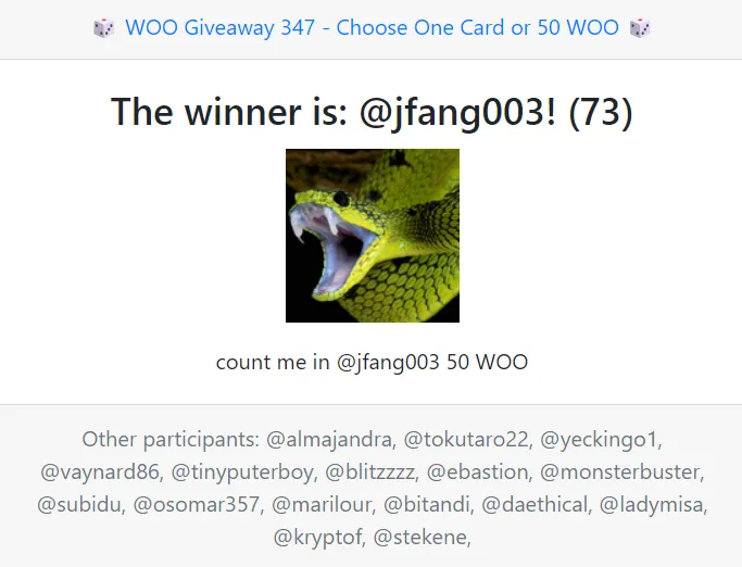 - You will need to leave a comment on this post writing which prize you want to receive if you are the winner. The prize will be one card of your choice (write the name of the card you wish to receive) or 50 WOO.