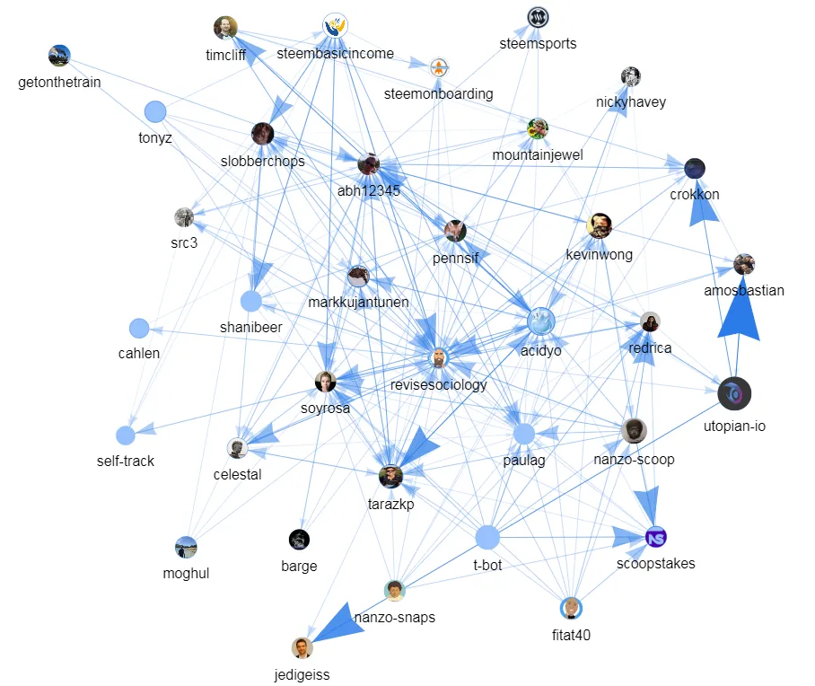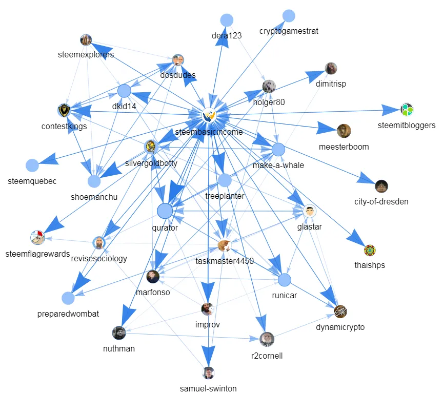 It only shows people that regularly upvote each other or @steembasicincome, or have high subscription levels for regular upvotes that are too big for our smaller voting accounts to deliver. That makes sense, because we have over 6000 active members that are voted by ten different accounts. All of those interrelationships would be too much for this chart.