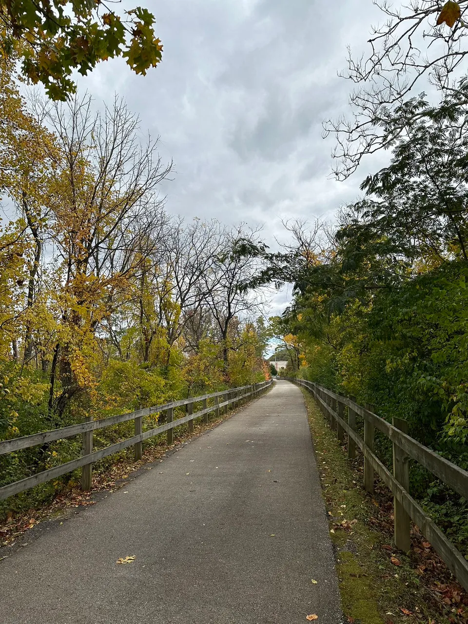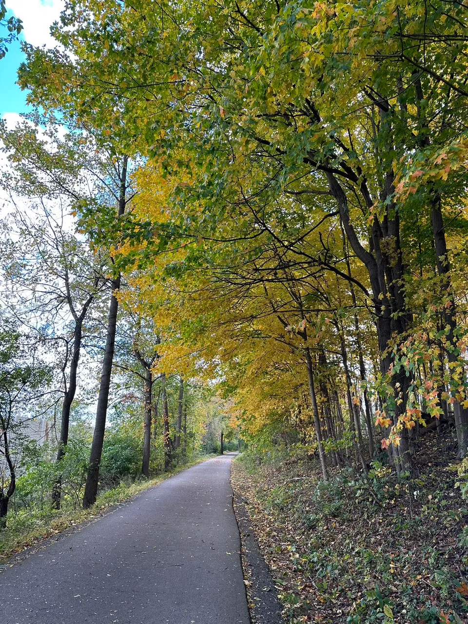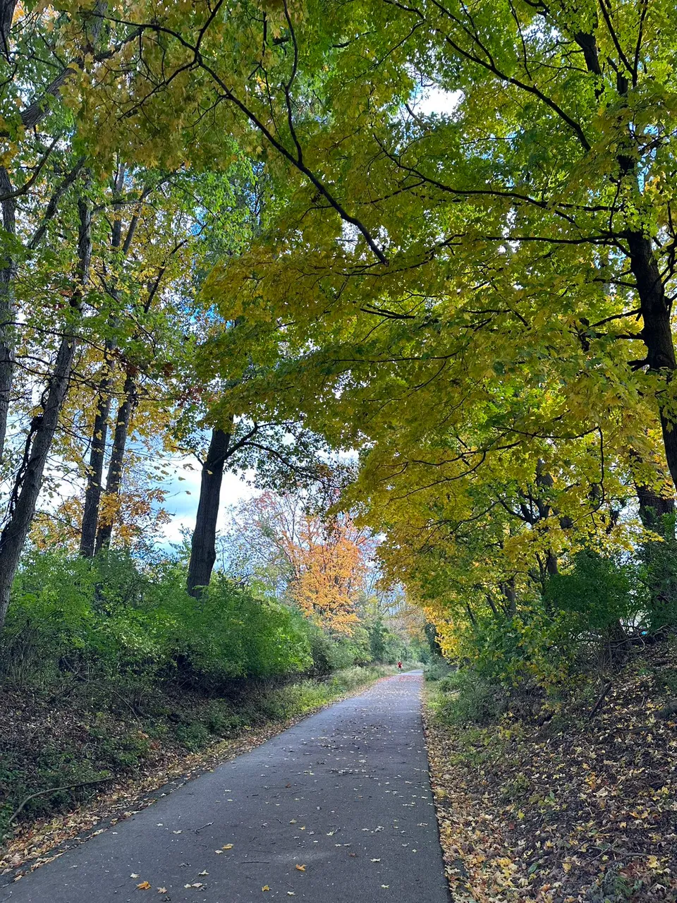 在路上有看到不少跑步的人。确实,这路线真是跑步的好地方。如果有人要锻炼长跑的话,真是最理想的地方。现在正值树叶颜色多变的季节,看着两边各种五彩斑斓的色彩,走在铺灌整齐的路上,不用担心有车子来往,非常安全。
