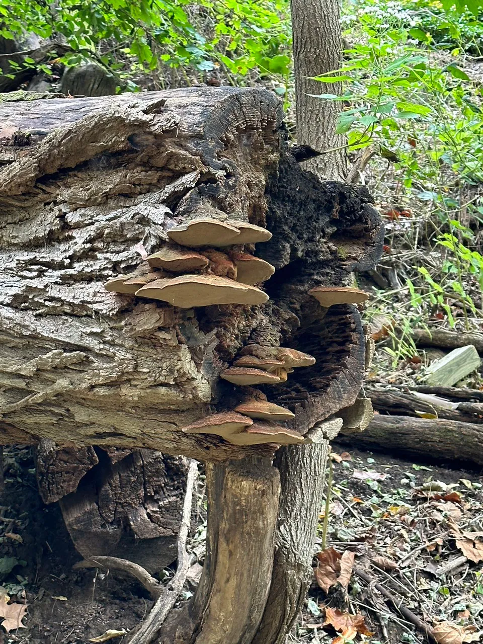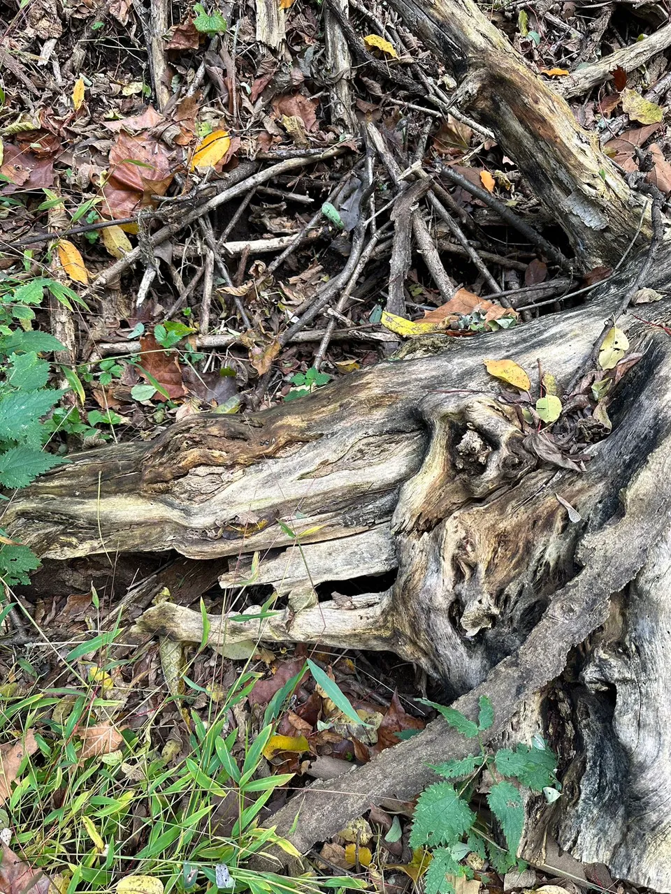 两边有一些被砍掉的树木头,有的长了不少菌类。显示强大的生命再循环。而地上的一块枯木头吸引了我们的注意力。看上去真的好像一只大象的脑袋呀。有眼睛,鼻子,想象的空间真大。