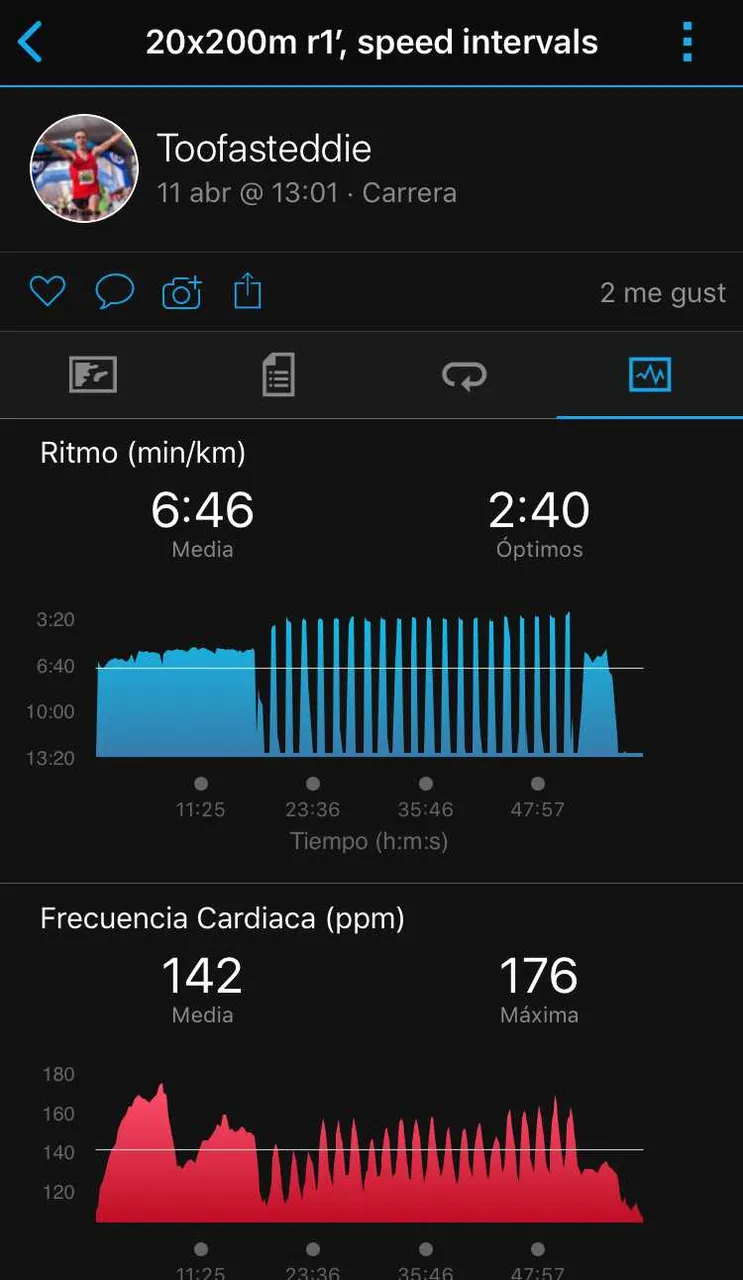 At the end, the workout was 3km of warmup jog followed by 20 repetitions of 200m starting at 44” the first and progressing till reaching 34” for the last repetition.